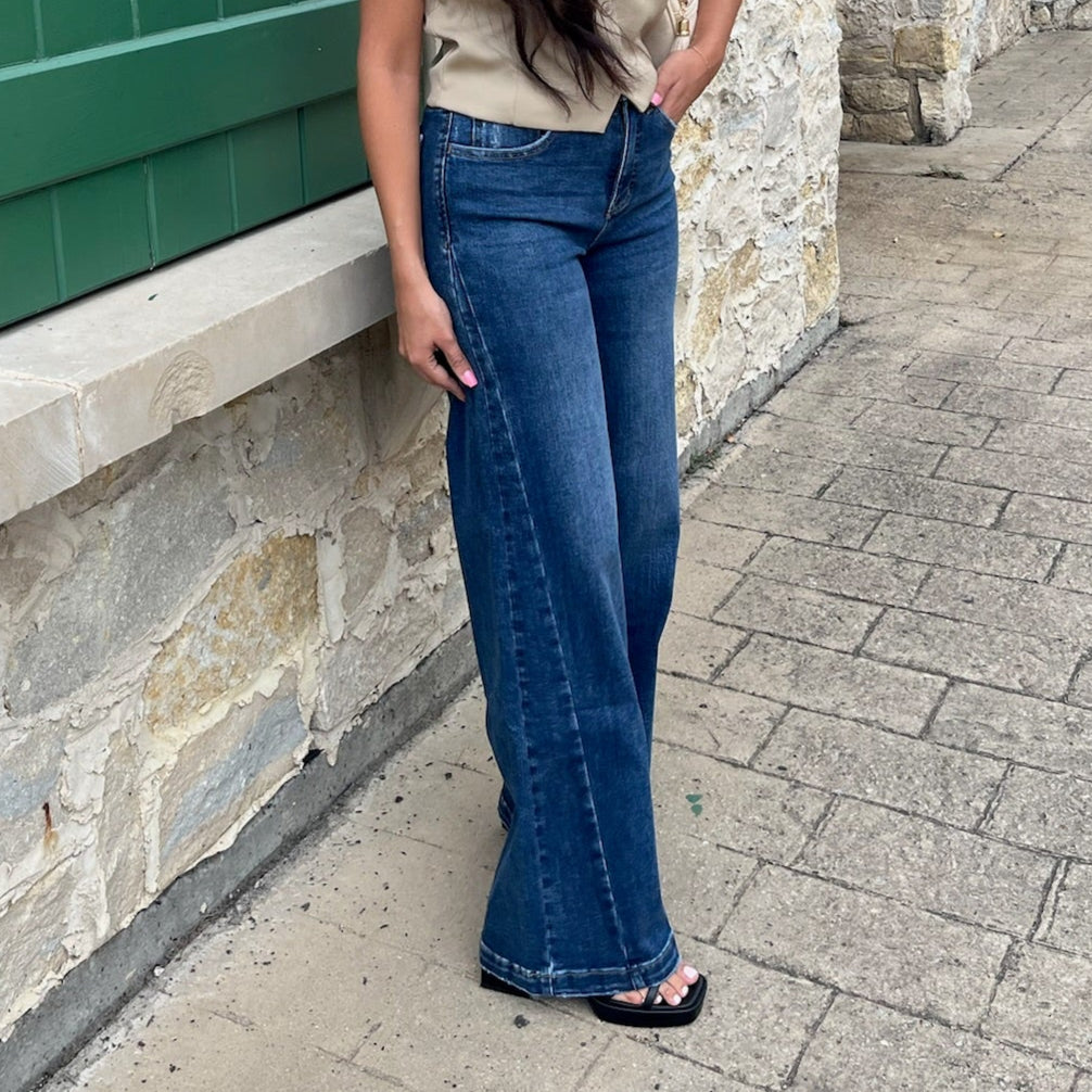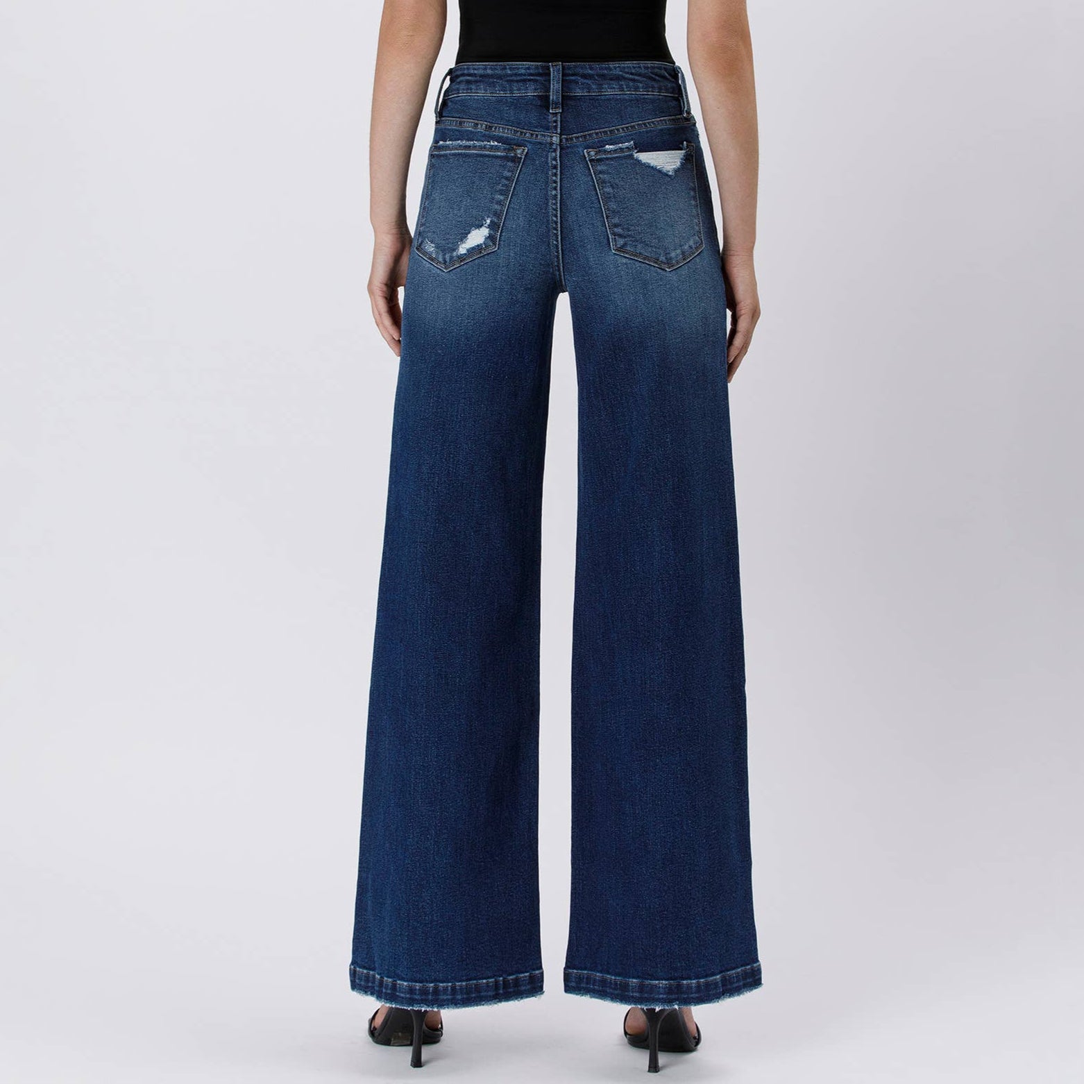 - These tummy control high-rise wide leg jeans are designed to flatter your shape with inner panels that smooth and support for a sleek, confident fit. Made from comfort stretch denim, they offer all-day wearability without sacrificing style. The lightly distressed details and finished hem give them a modern edge, making them perfect for everything from workdays to weekend outings. A true must-have, these jeans combine comfort, style, and figure-enhancing features in one essential pair.