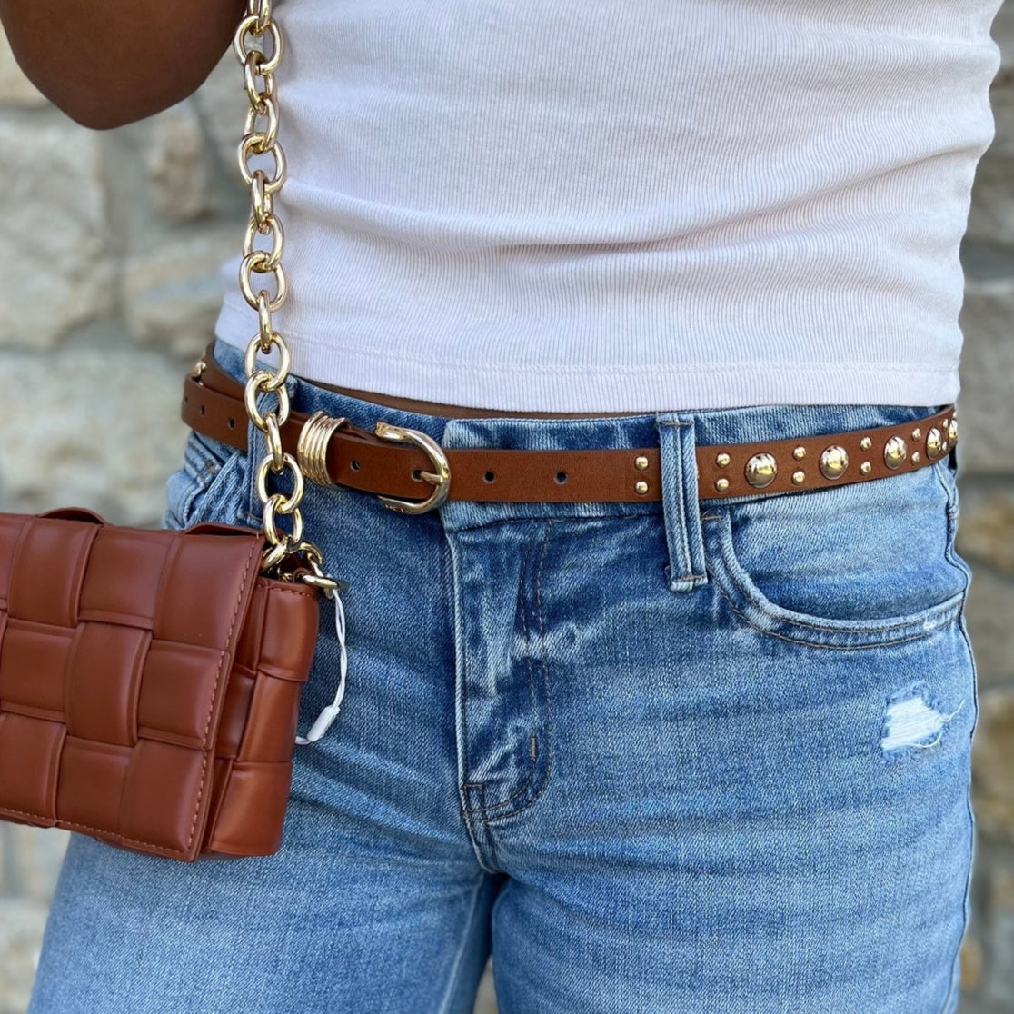 - Add a touch of edge to any outfit with our studded thin belt. Simple in design but adorned with gold studs, it’s the perfect accessory to elevate everything from concerts and date nights to coffee runs. Lightweight and versatile, it works effortlessly with jeans, dresses, or skirts, making it a wardrobe staple. Available in classic black and rich brown, this belt is the must-have finishing touch for your everyday style.