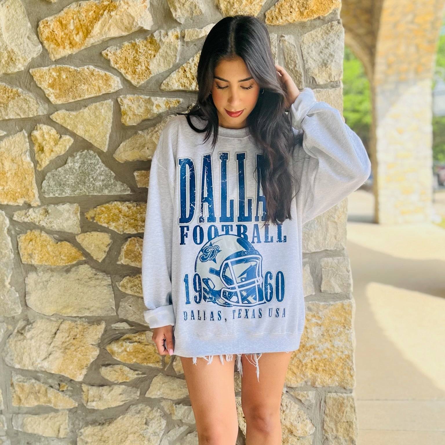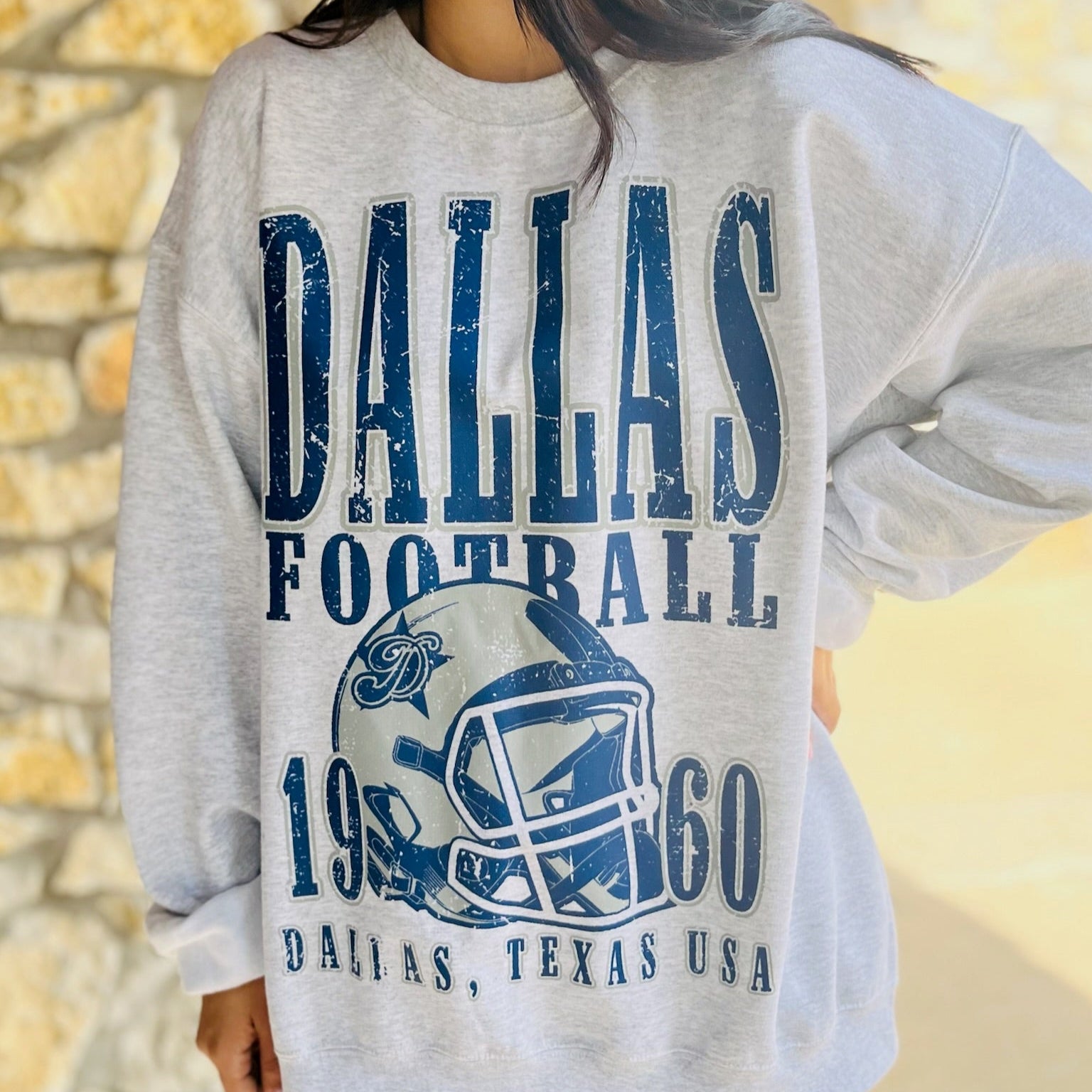 - Rep America’s Team in the coziest way with this vintage-inspired Dallas Football sweatshirt - made for die-hard fans and stylish game day gals alike. The oversized fit and throwback design give it that classic 90s vibe, perfect for tailgates, stadium seats, or Sunday watch parties. Featuring bold blue & grey graphics with a football helmet and nods to 1960 and Dallas, TX - this one’s a must for every true fan ready to bring the energy all season long. Game day isn’t complete without it!!!