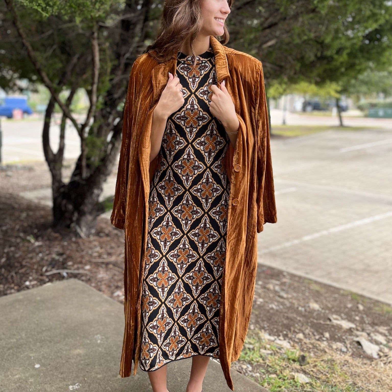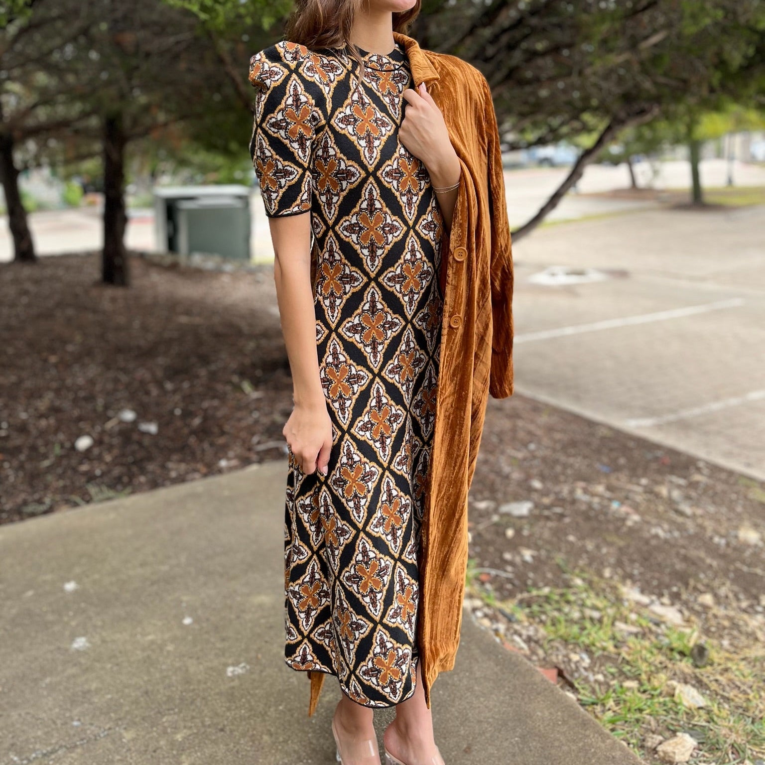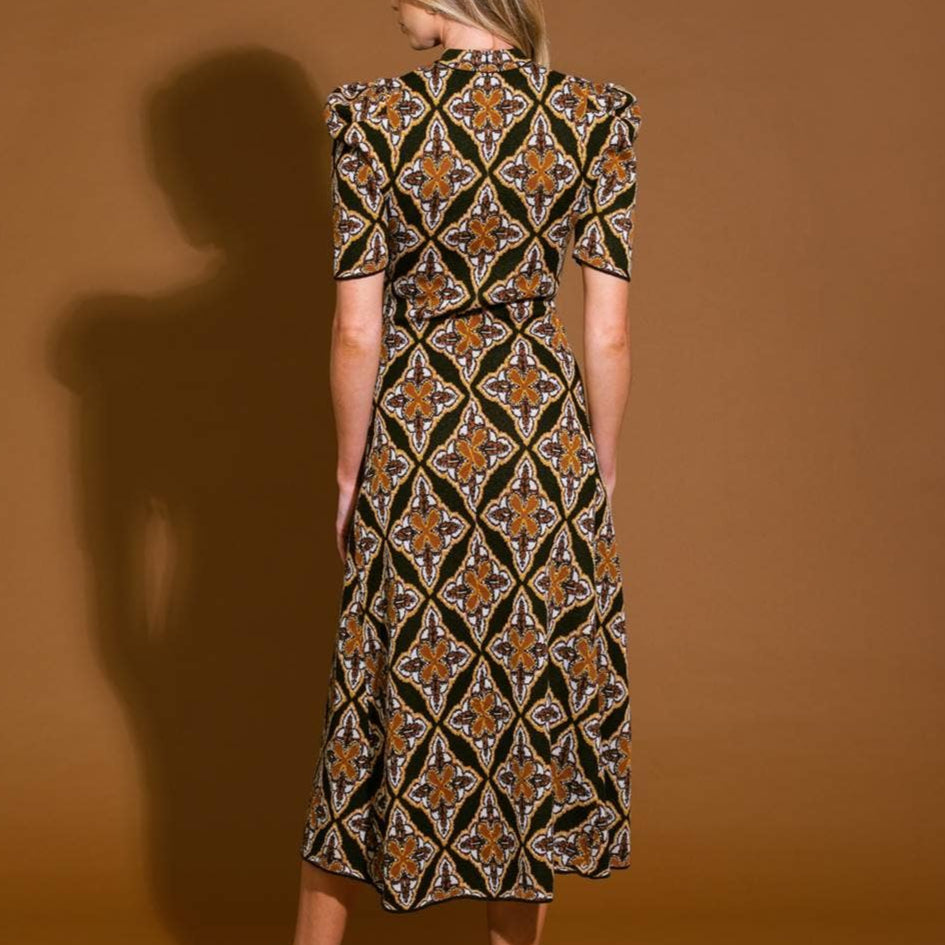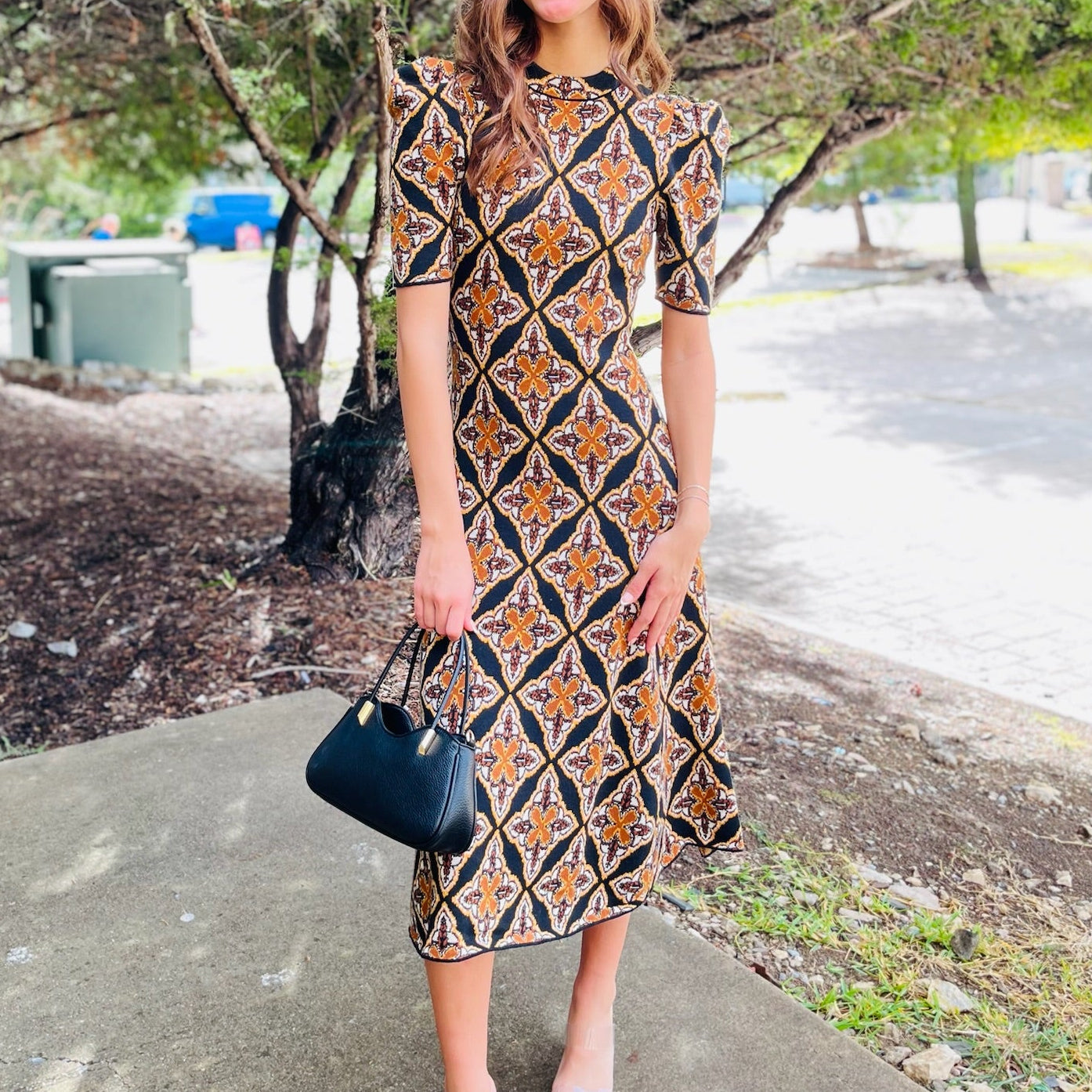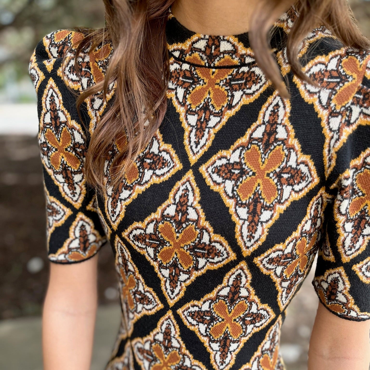 Turn heads this season in this midi dress - a timeless and elegant piece designed to flatter in all the right ways. Crafted in a rich jacquard knit with deep warm tones against a black base, this dress brings sophistication and subtle drama. The high neckline and slight puff short sleeves add a chic, feminine touch, while the form-fitting bodice and A-line midi skirt create a silhouette that’s both refined and comfortable. Perfect for cool-weather weddings, church, or holiday soirées, this is the dress you’ll reach for when you want to feel confident, classy, and unforgettable.