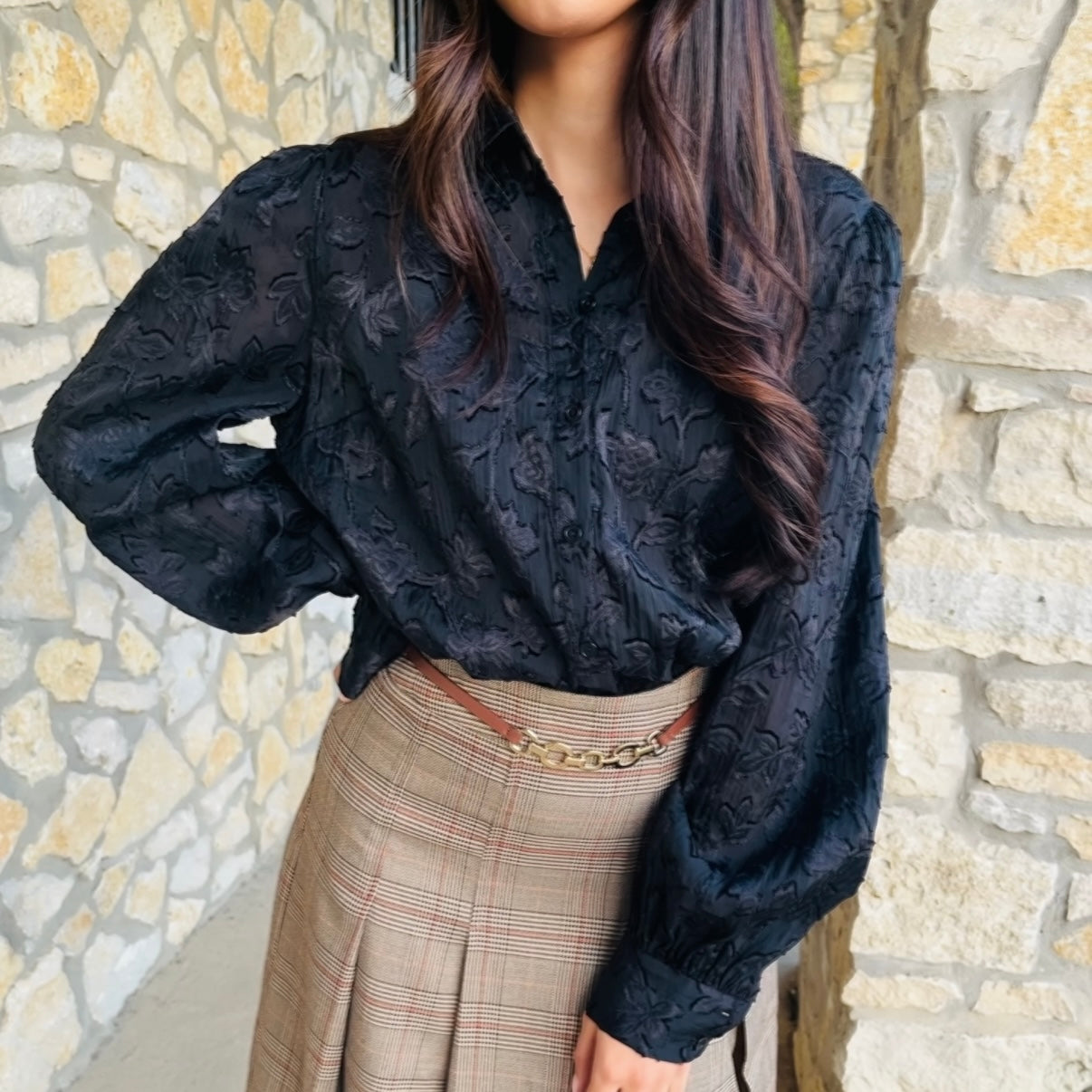 - Seriously, the cutest little top ever! Sleek, stylish, and classy- the button down top with jacquard pattern is stunning!