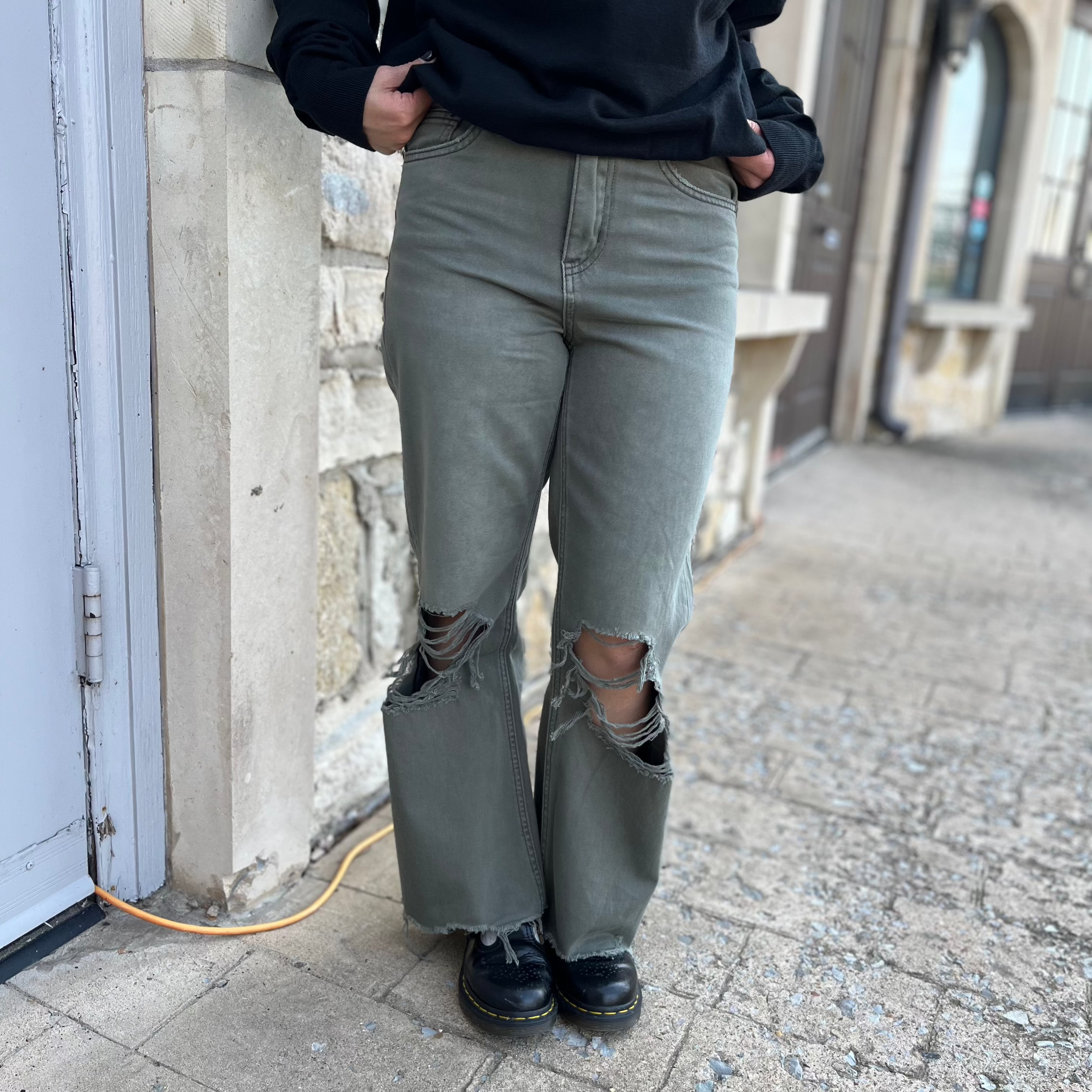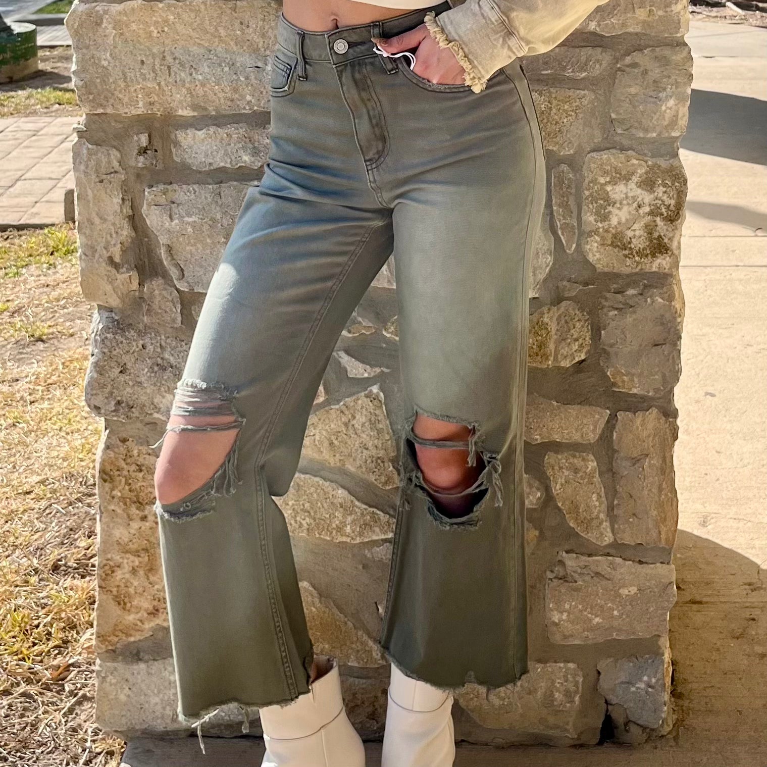 - Bring a fresh twist to your fall denim with these washed green olive 90’s vintage jeans. Designed with a high waist, relaxed wide leg, and cropped flare cut, they deliver that effortlessly cool, throwback vibe. Distressed details and the authentic rigid texture keep the look laid-back and edgy, perfect for pairing with a cozy neutral sweater or layering up with a bold mesh top for a night out. A statement piece that’s as versatile as it is stylish, these jeans are bound to be a fall favorite.