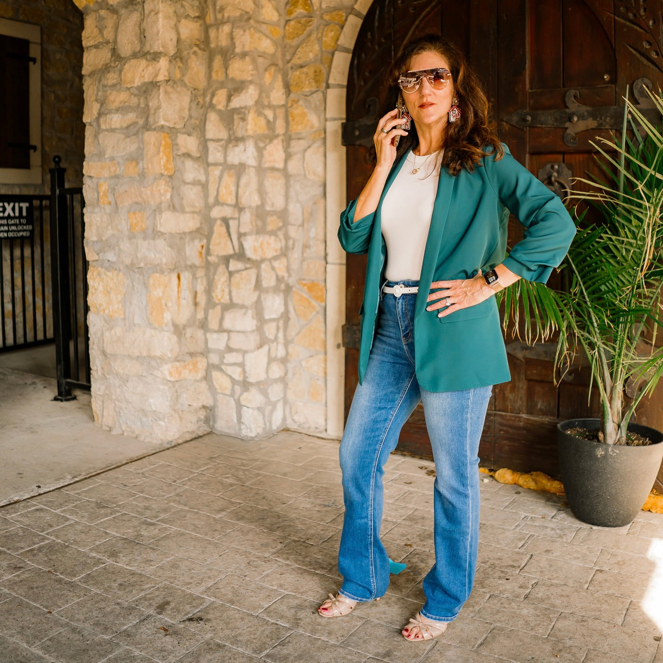 relaxed fit blazer, ruched sleeve blazer, 3/4 sleeve blazer, shoulder pad blazer, dropped shawl collar blazer, flap pocket blazer, versatile women’s blazer, office blazer, dressy casual blazer, polished workwear blazer, boutique blazer, structured yet relaxed blazer, chic everyday blazer, stylish layering blazer, solid color blazer, professional women’s blazer, date night blazer, hand wash blazer, timeless wardrobe blazer, sophisticated blazer for women, forest green blazer, fuchsia blazer, white blazer