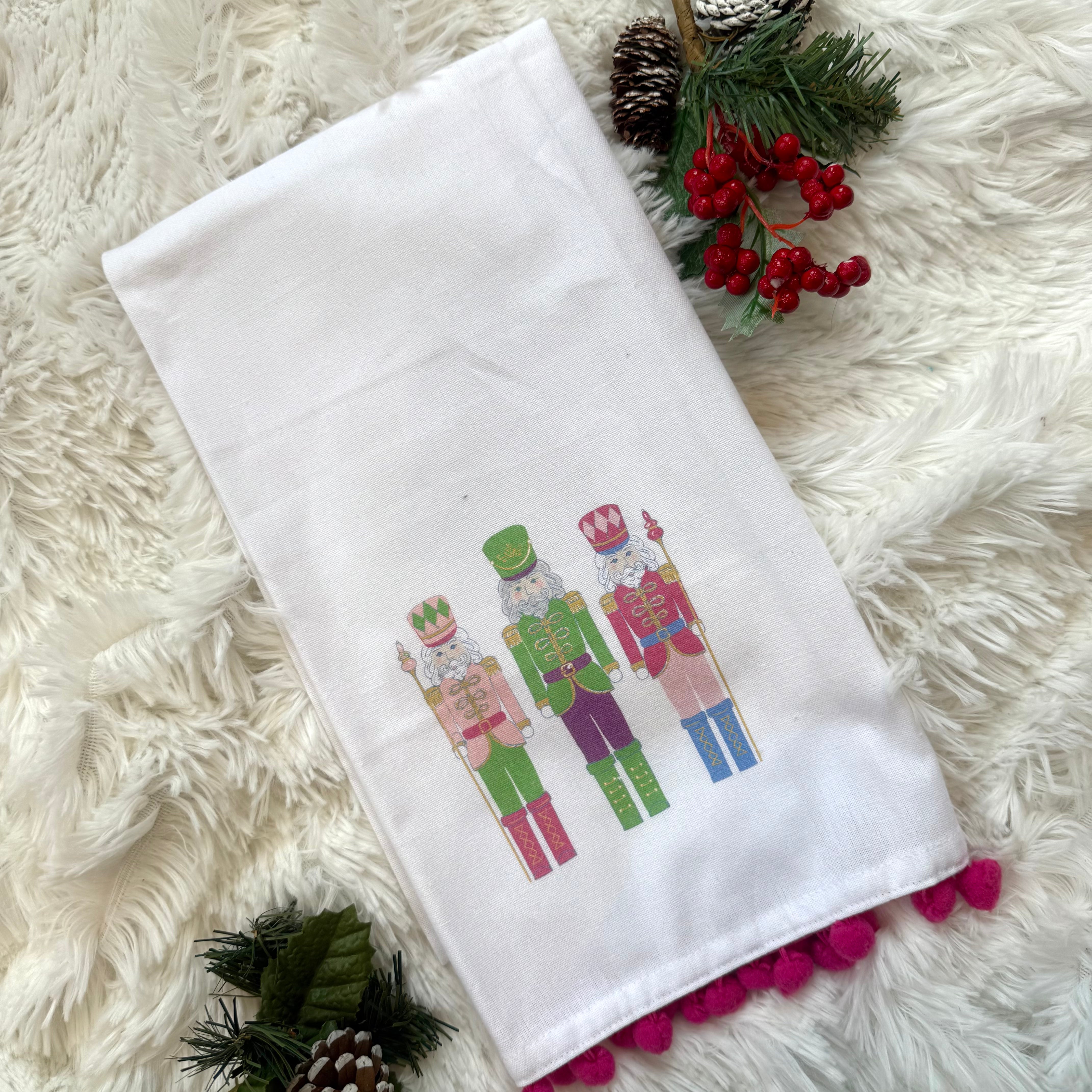 - Bring the magic of the season into your kitchen with our Nutcracker tea towel! Featuring a whimsical multicolor nutcracker design and finished with a playful hot pink pom-pom hem, this towel is the perfect blend of festive and fun. Made from 100% cotton, it’s as practical as it is charming - whether you’re gifting it to teachers, hostesses, or treating yourself. A delightful touch of holiday spirit for any home!