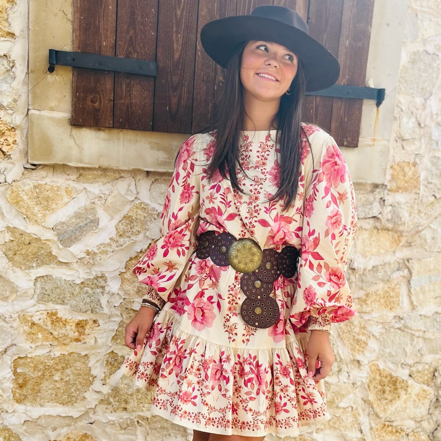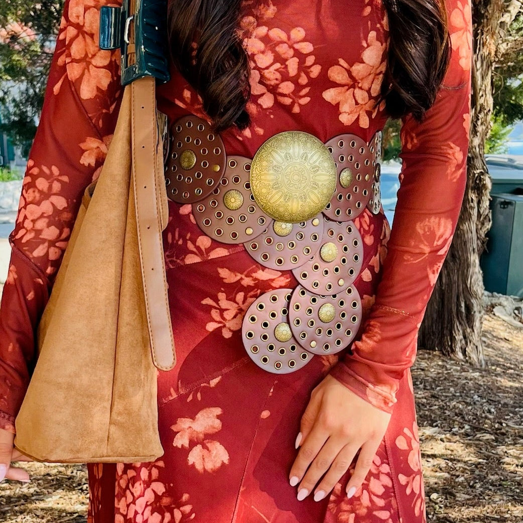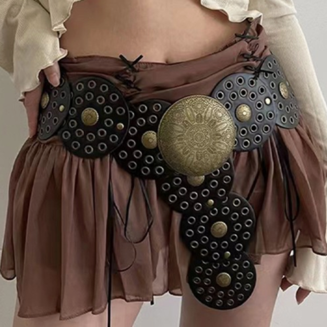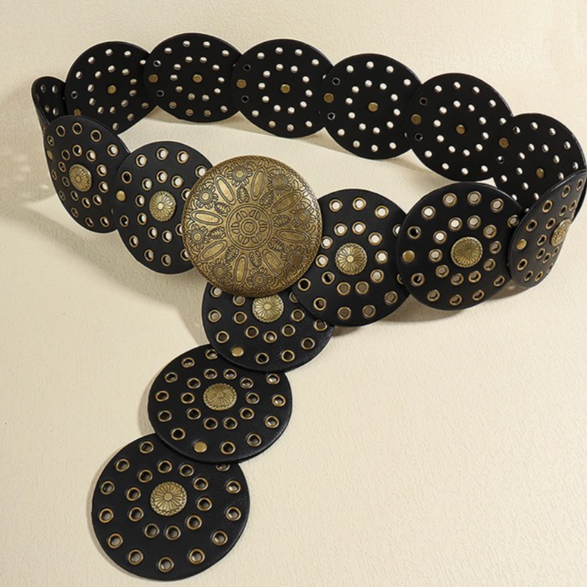 western belt, boho chic belt, round panel belt, eyelet detail belt, oversized belt, antique gold belt, black faux leather belt, brown faux leather belt, western boho accessory, statement belt, trendy boho belt, cowboy chic belt, rodeo fashion belt, country western belt, festival outfit belt, denim belt accessory, flowy skirt belt, bohemian style belt, gold hardware belt, versatile fashion belt