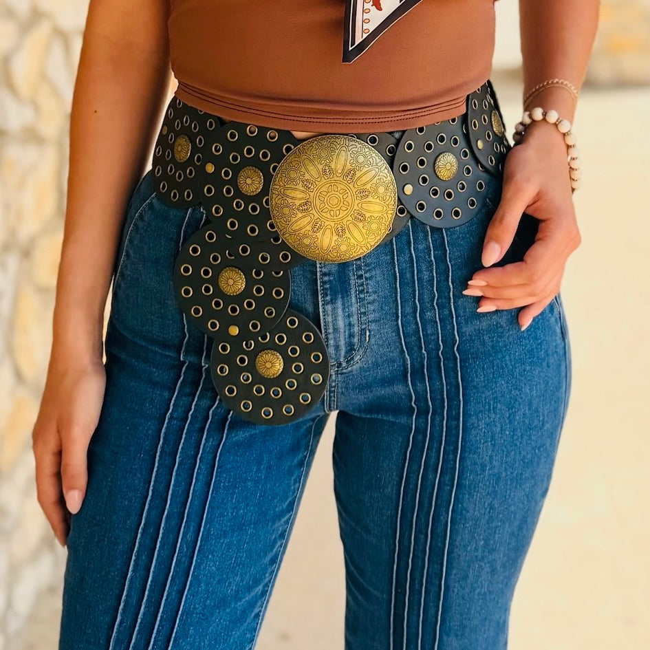 - Bring a touch of western boho chic to any look with this stunning statement belt. Featuring bold round panels and eyelet detailing, it’s the perfect mix of trendy and timeless. Whether you’re styling it with denim, flowy skirts, or a simple dress, this oversized belt instantly elevates your outfit. Available in classic black or brown with antique gold accents, it’s a versatile accessory you’ll reach for again and again.