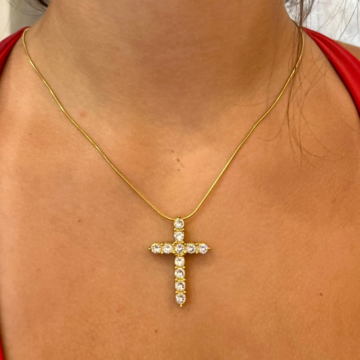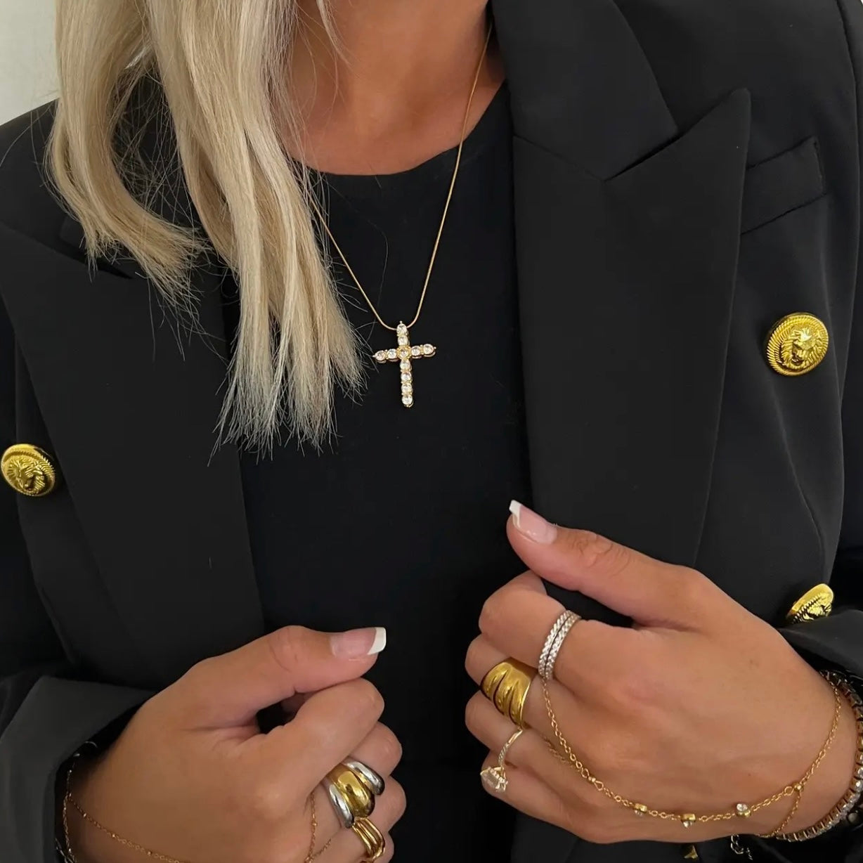 Shine with meaning in the Faith & Sparkle Rhinestone Cross Necklace. This elegant piece features a classic cross pendant adorned with shimmering rhinestones, capturing the light—and attention—with every movement. Delicate yet eye-catching, it’s designed to symbolize faith while adding a touch of glamour to your everyday look.
