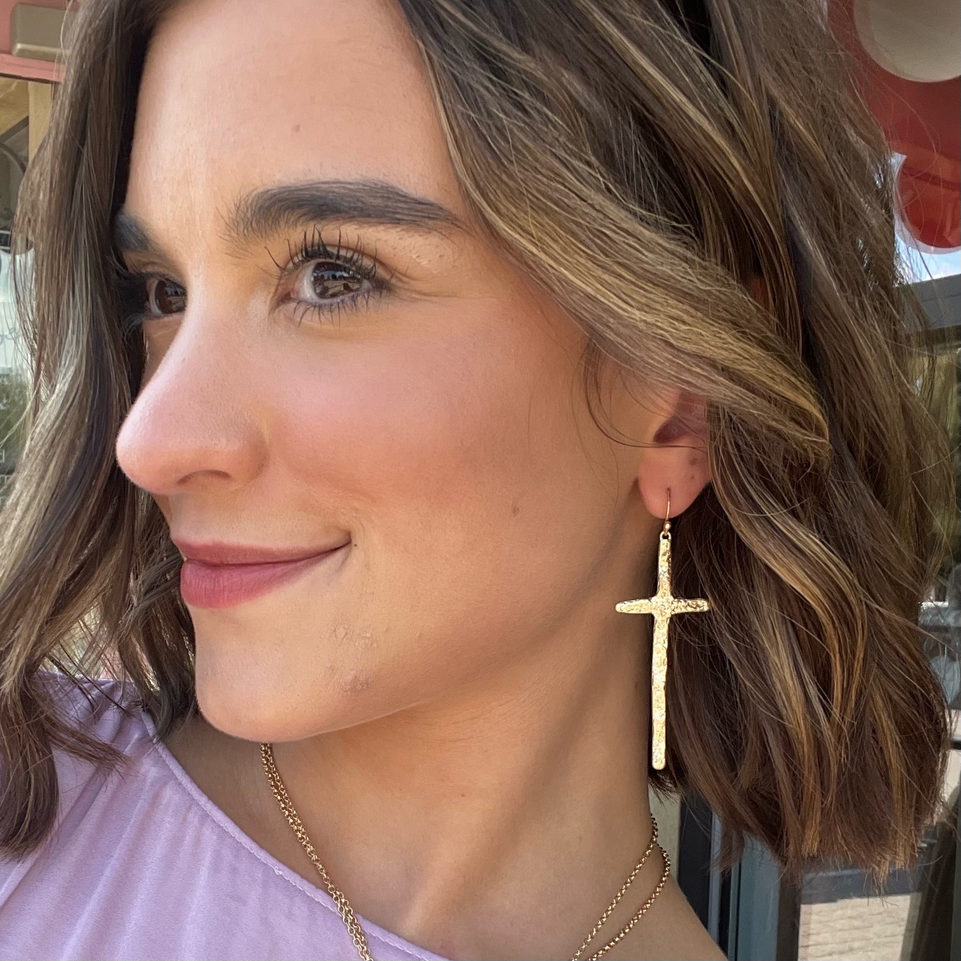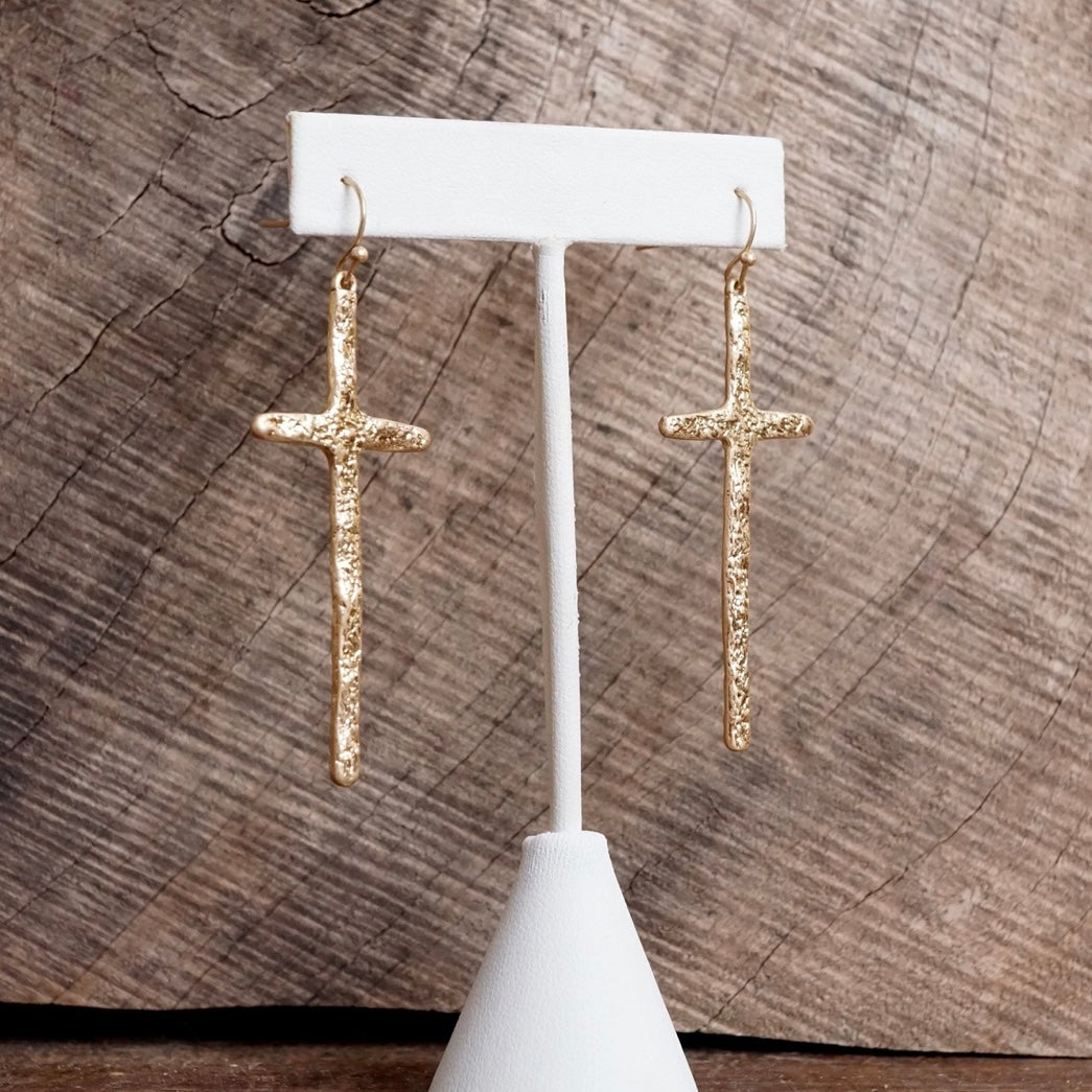 These hammered gold cross earrings are a stunning statement of faith and fashion. With their rustic, handcrafted finish and elegant drop design, they add a meaningful touch to any outfit—whether you're dressing up for Sunday brunch or keeping it casual!