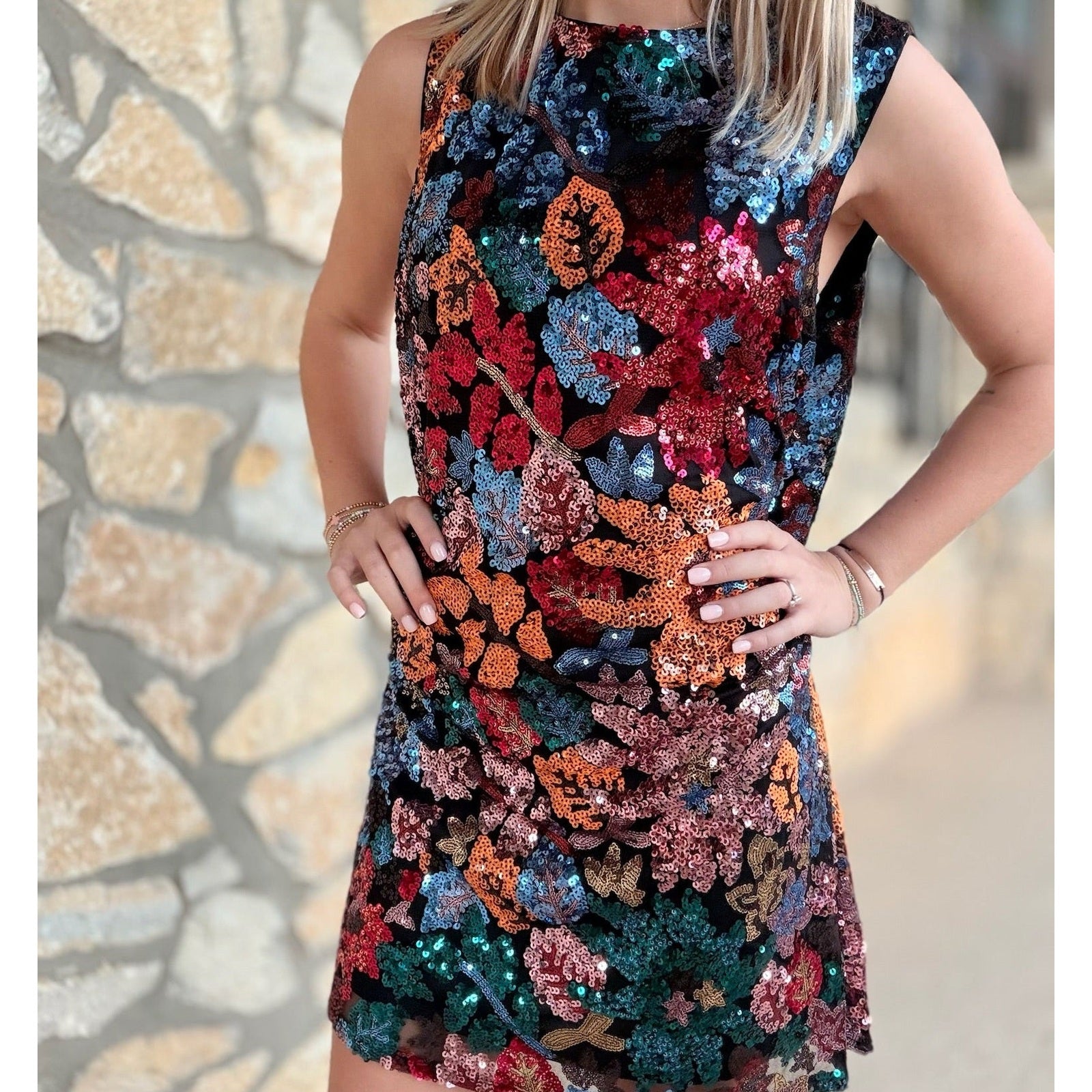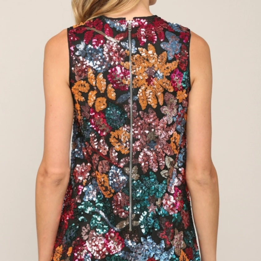 Turn heads in this dazzling sleeveless mini dress, bursting with vibrant color and personality. Covered in an intricate array of multicolored sequins, the dress features a bold floral pattern that shimmers with every movement. The high neckline and classic shift silhouette offer a flattering, streamlined fit that’s both playful and sophisticated. Perfect for parties, special occasions, or a glamorous night out, this statement piece brings sparkle and style in equal measure. Just add heels and minimal accessories to let the dress shine.