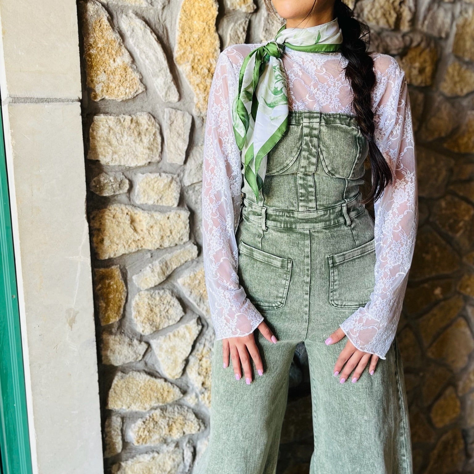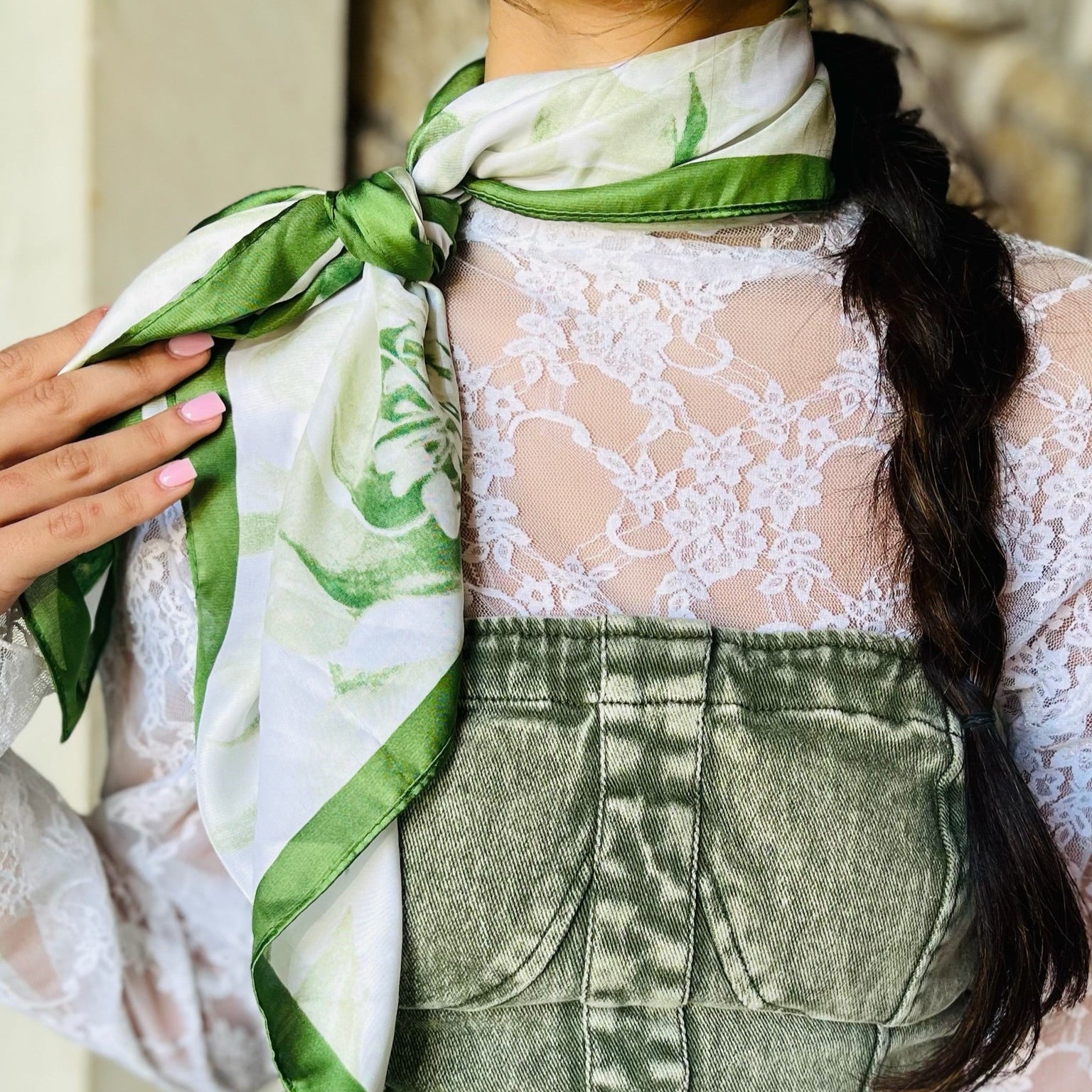 - Elevate any look with this silky floral scarf, featuring a delicate green-and-white print framed by a bold solid border. Lightweight and versatile, it’s the perfect accessory to style your way - whether tied around your neck, woven through your hair, looped on a belt, or wrapped on your favorite bag. Chic and timeless, it adds the perfect finishing touch to every outfit.
