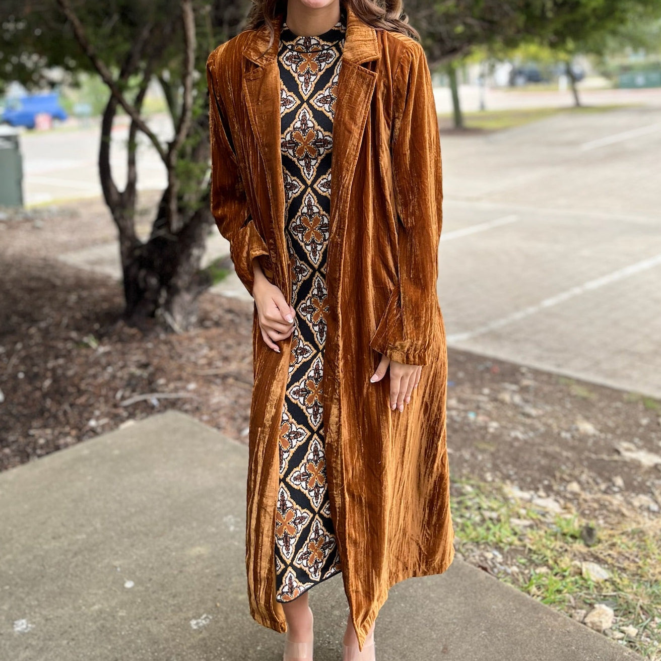 Elevate your wardrobe with this luxe crushed velvet blazer - a perfect blend of sophistication and modern edge. Featuring a longline silhouette, padded shoulders, and lapel collar, it adds structure while remaining effortlessly chic. The open front with optional button closure, side pockets, and subtle side slits make it versatile enough to layer over dresses, trousers, or jeans. Available in elegant blue grey and warm camel, this blazer is a statement piece that transitions seamlessly from office meetings to evening outings.