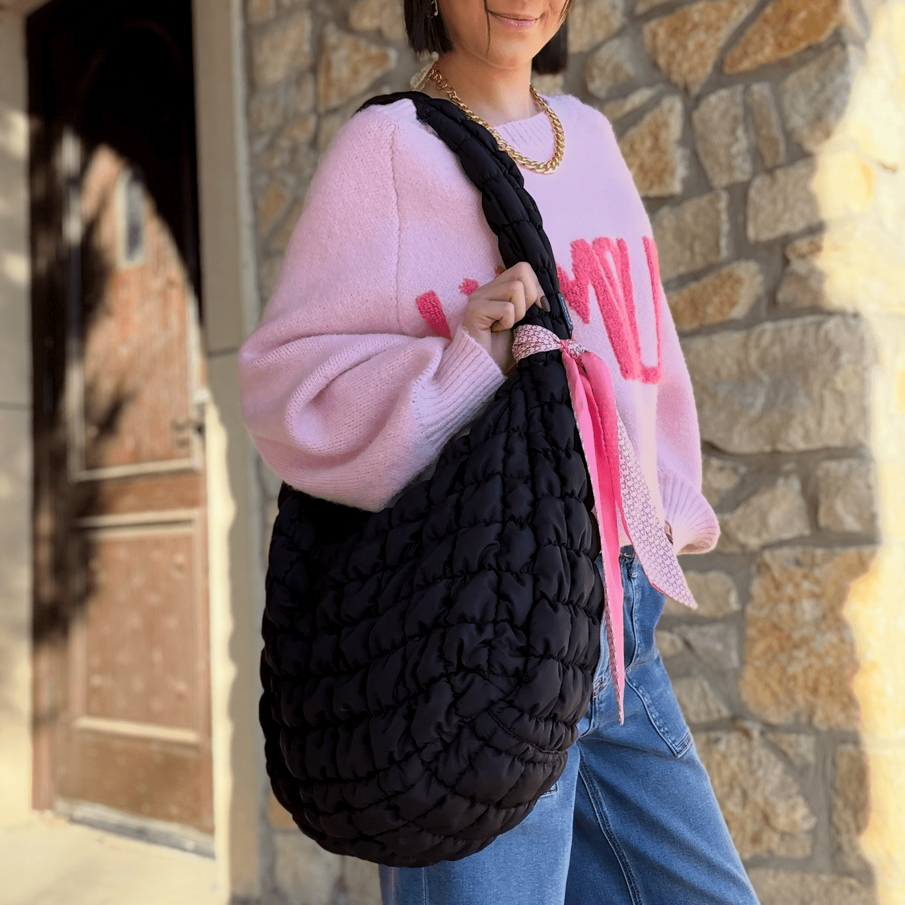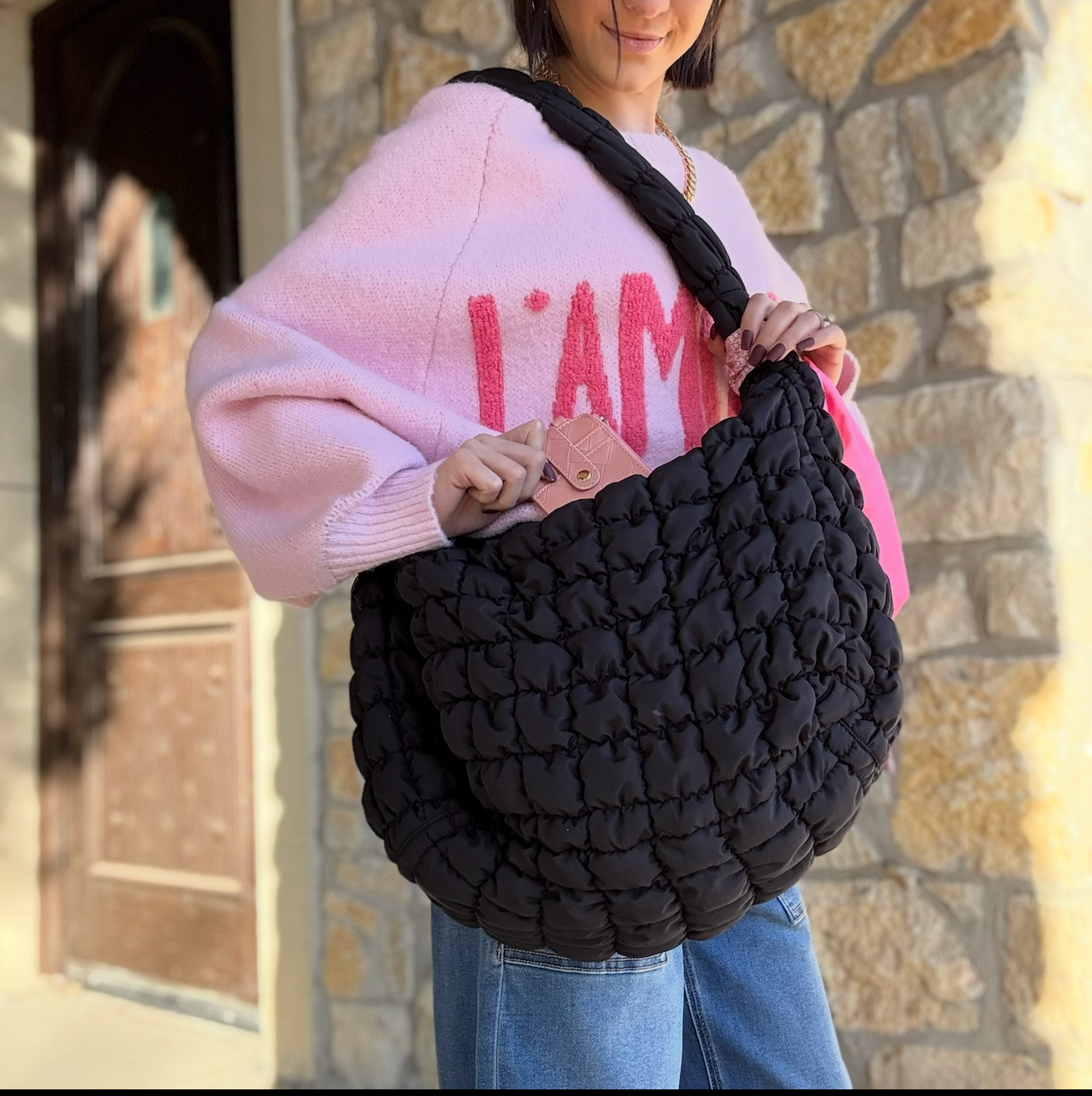 - Meet your new go-to bag that effortlessly blends style and functionality! This oversized puff quilted shoulder bag is perfect for carrying all your essentials while keeping you on-trend. Wear it as a chic shoulder bag or as a convenient crossbody for hands-free days. Easy to maintain and clean, it comes in versatile black or beige and is the ultimate everyday statement piece!