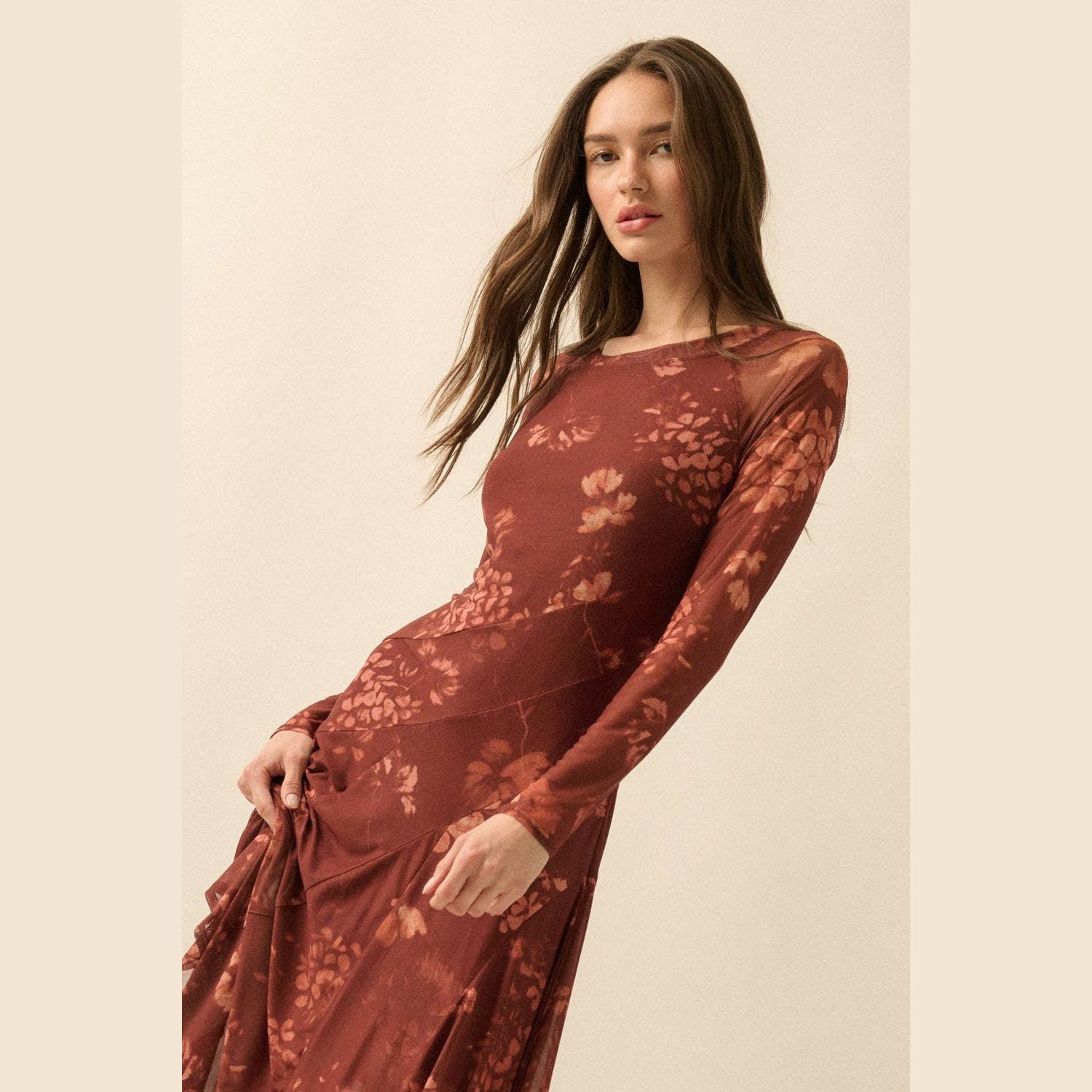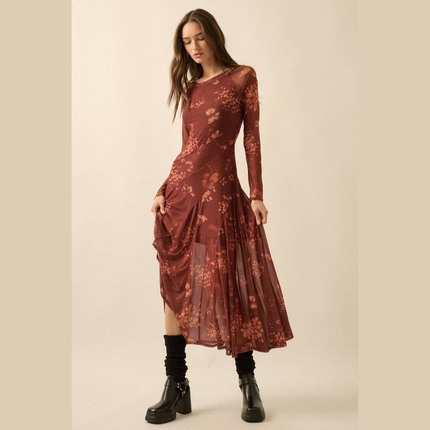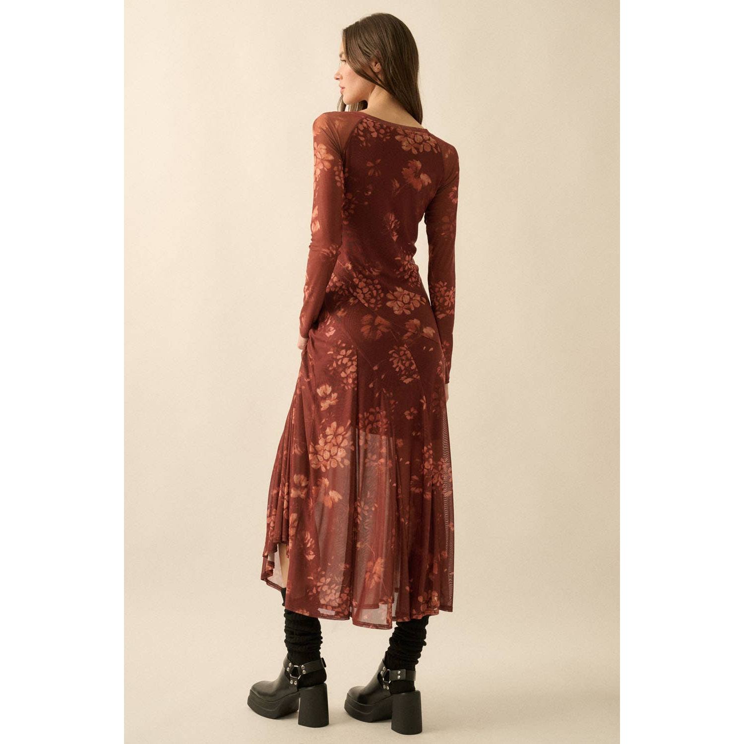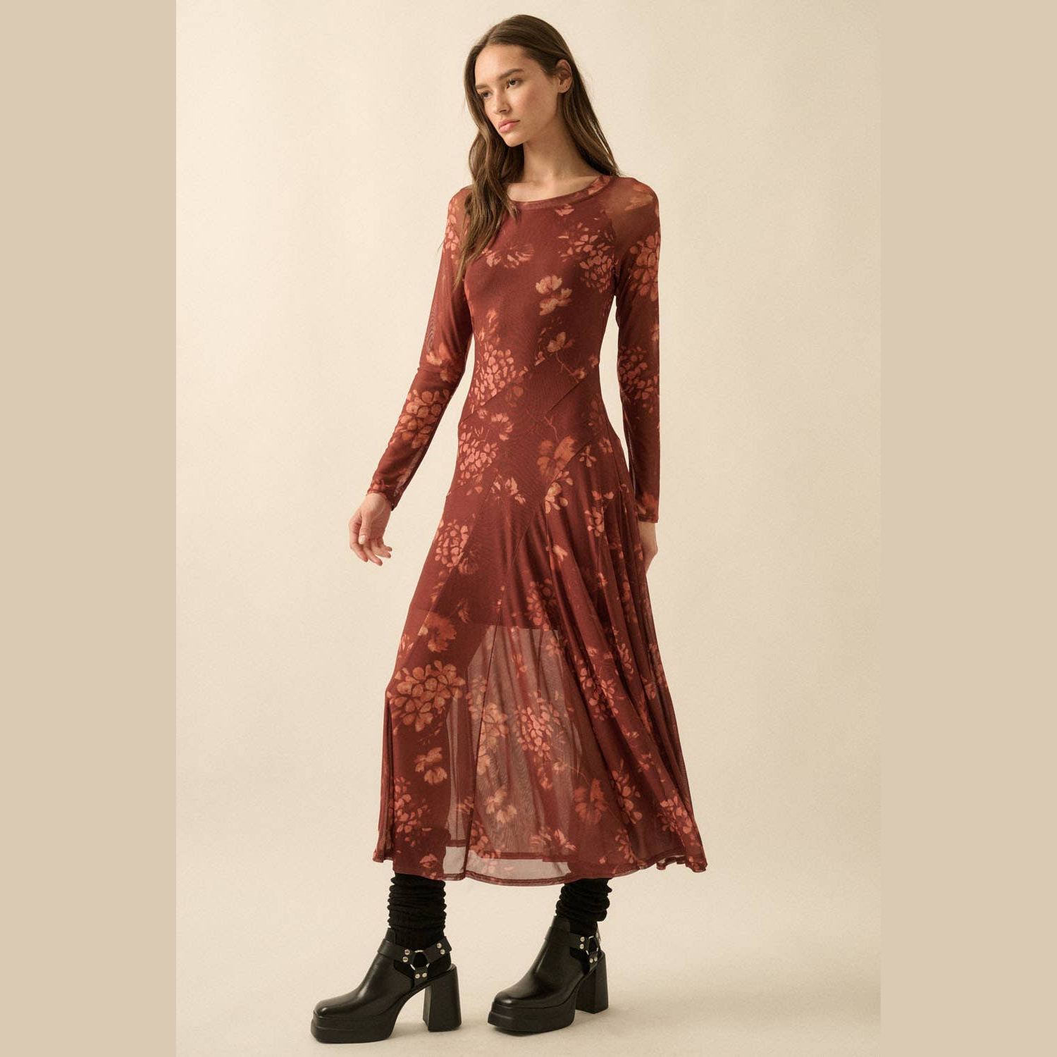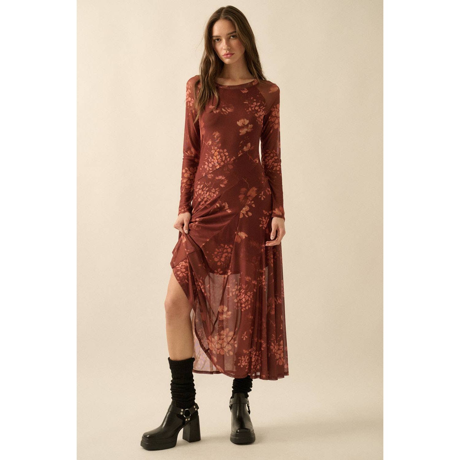 Romantic, moody, and effortlessly chic - the burgundy floral mesh dress is a seasonal standout. With sheer sleeves, a fitted silhouette, and a flared skirt, this dress blends elegance with just the right touch of edge. The jewel-toned florals make it perfect for fall and winter while still wearable year-round. Dress it down with boots and a jacket for coffee dates or game days, or elevate it with heels and statement jewelry for weddings, holiday parties, or nights out. A versatile piece that’s as timeless as it is trendy.