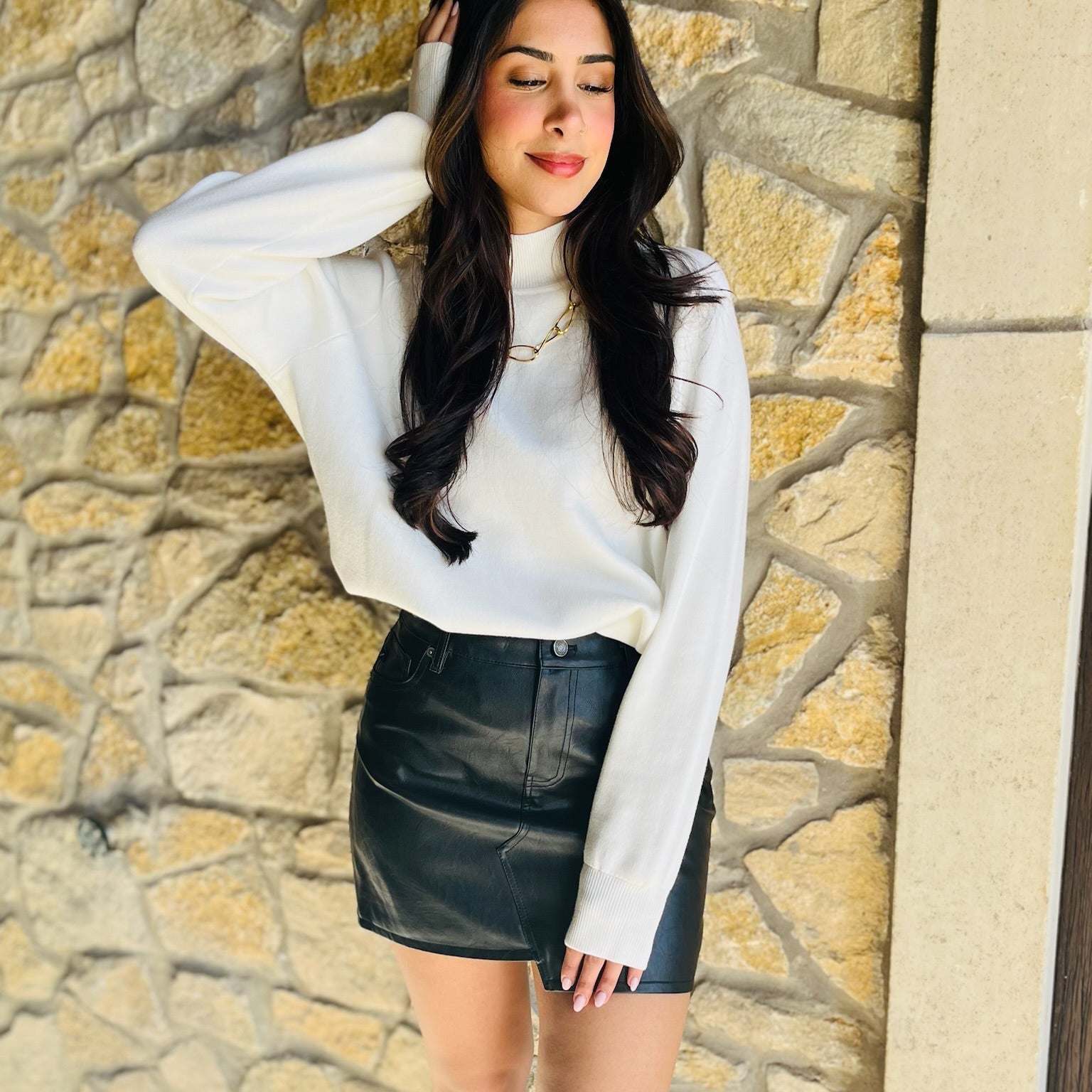 leather mini skirt, PU leather skirt, faux leather mini, edgy mini skirt, rocker style skirt, holiday party skirt, winter fashion skirt, fall fashion skirt, statement mini skirt, lined leather skirt, high waist mini skirt, zipper closure skirt, pocketed mini skirt, belt loop skirt, chic leather skirt, off-duty model outfit, edgy holiday outfit, tall boots outfit, sleek booties outfit, versatile mini skirt
