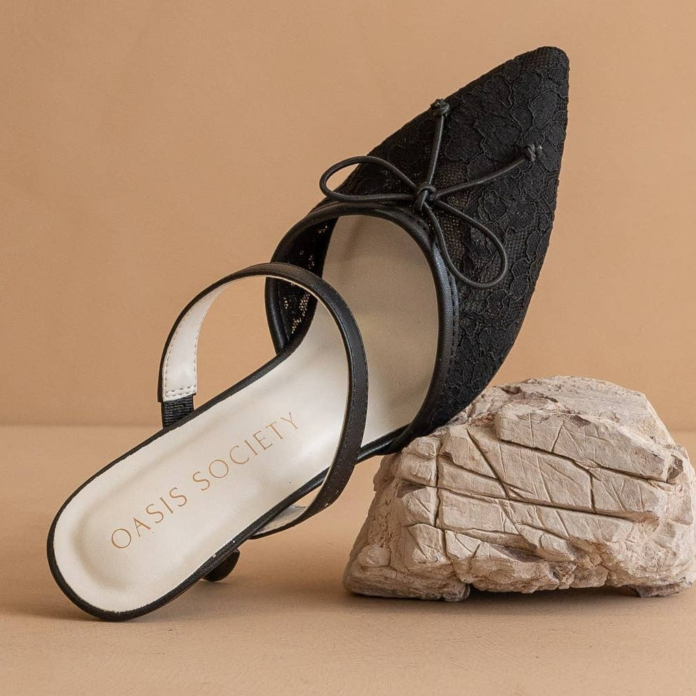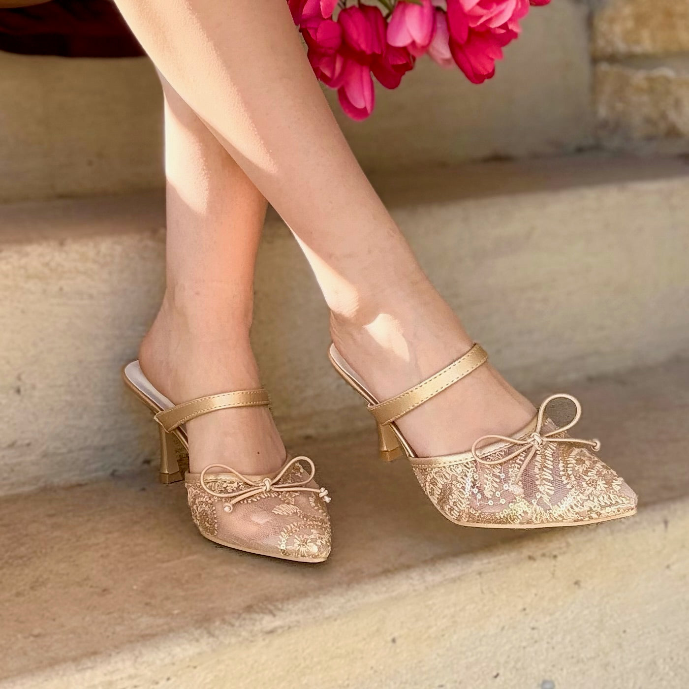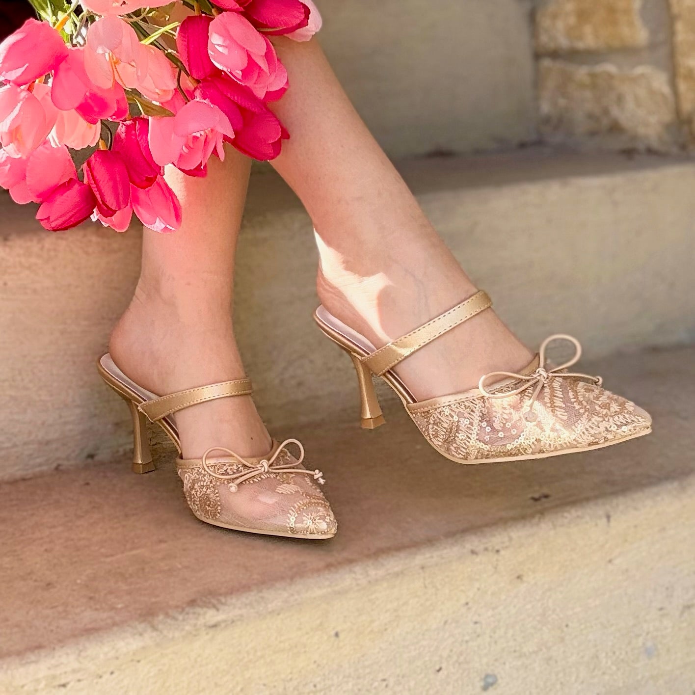 - The Katie heels are strappy pointed-toe heels are pure elegance with a playful, feminine twist. The delicate lace and small bow details make them perfect for weddings, date nights, or special occasions, while the slim stiletto heel adds a polished, sophisticated touch. Pair them with dresses, skirts, or tailored pants to elevate any outfit effortlessly. Available in sparkling gold or classic black, these heels bring a touch of glamour and charm to every look