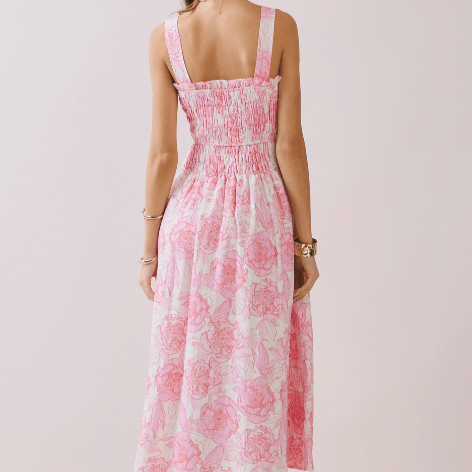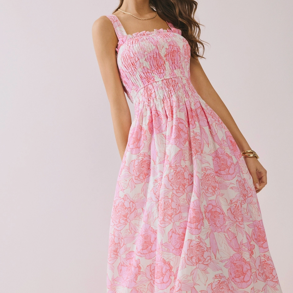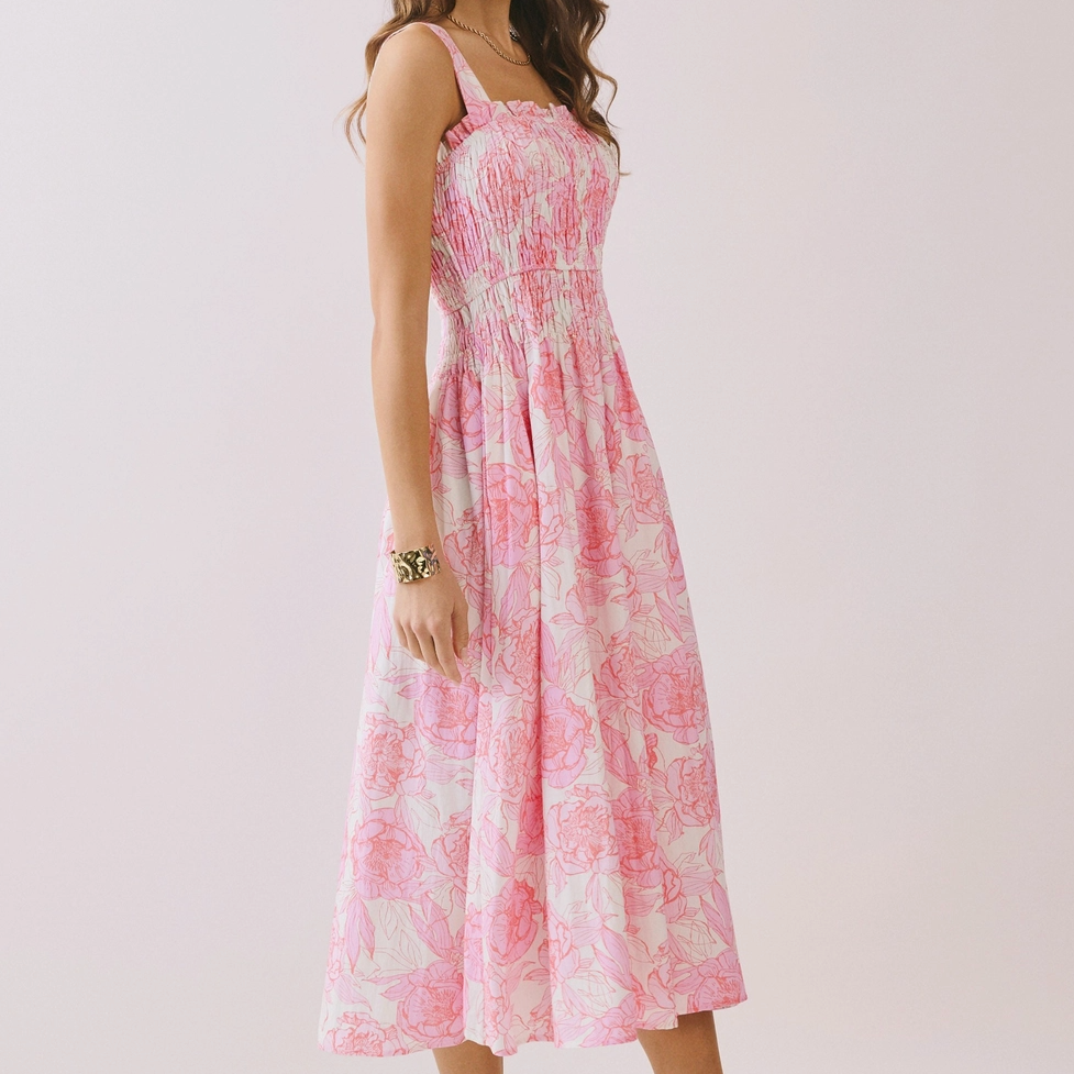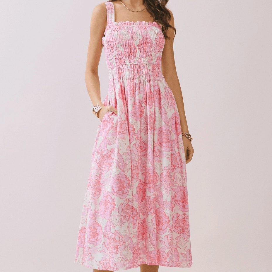Romantic and effortlessly flattering, our Floral Print Smocked Bodice A-Line Midi Dress features a comfortable smocked bodice and a flowing A-line silhouette that moves beautifully with you. Finished in a soft floral print, it’s the perfect choice for brunch dates, garden parties, and sunny-day moments!