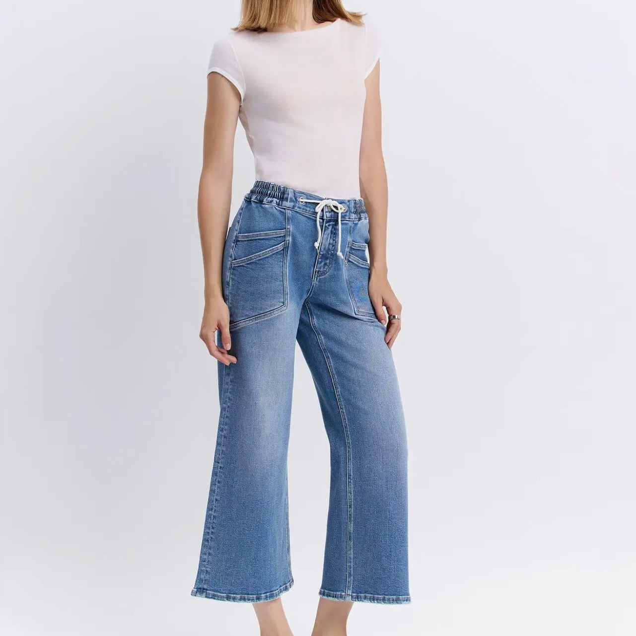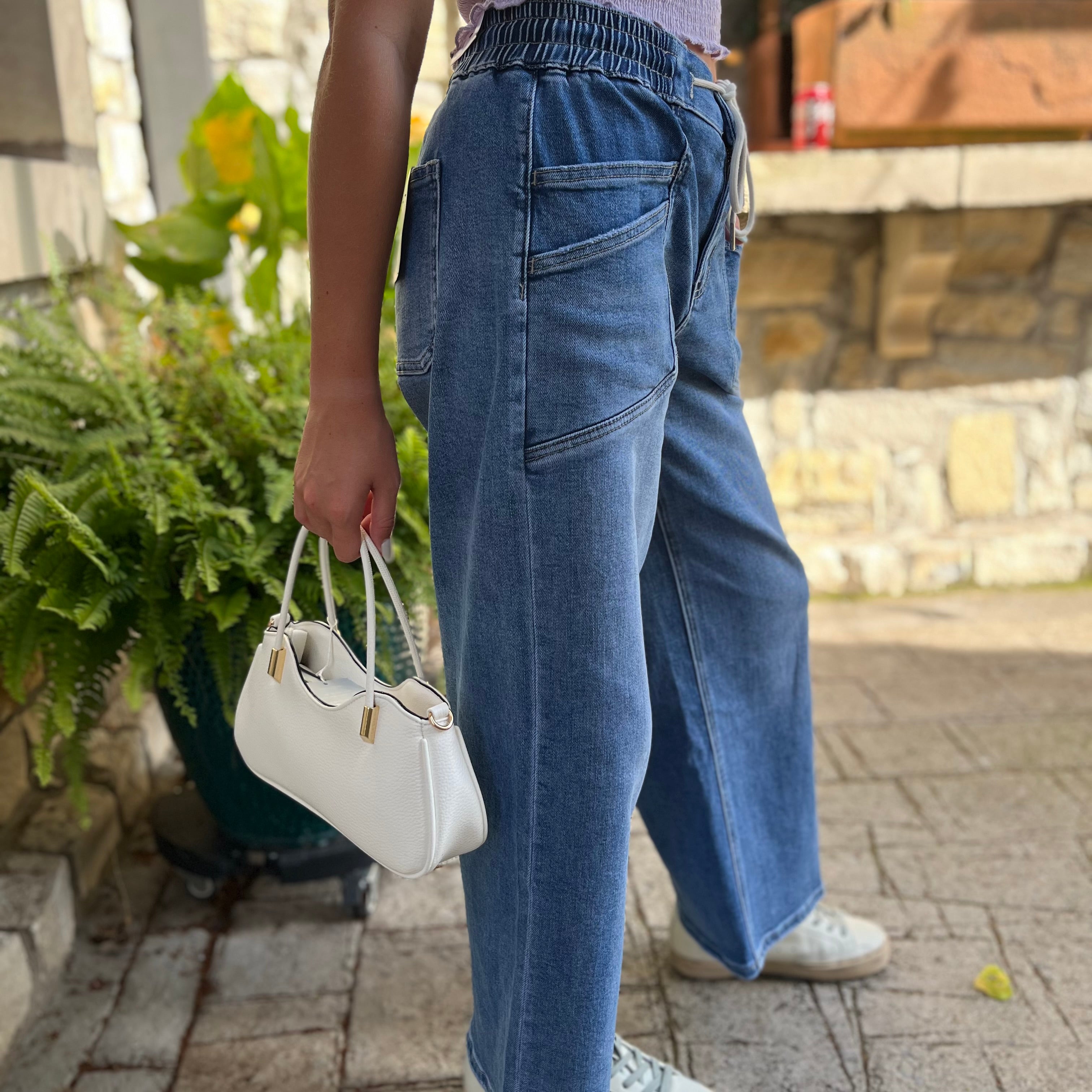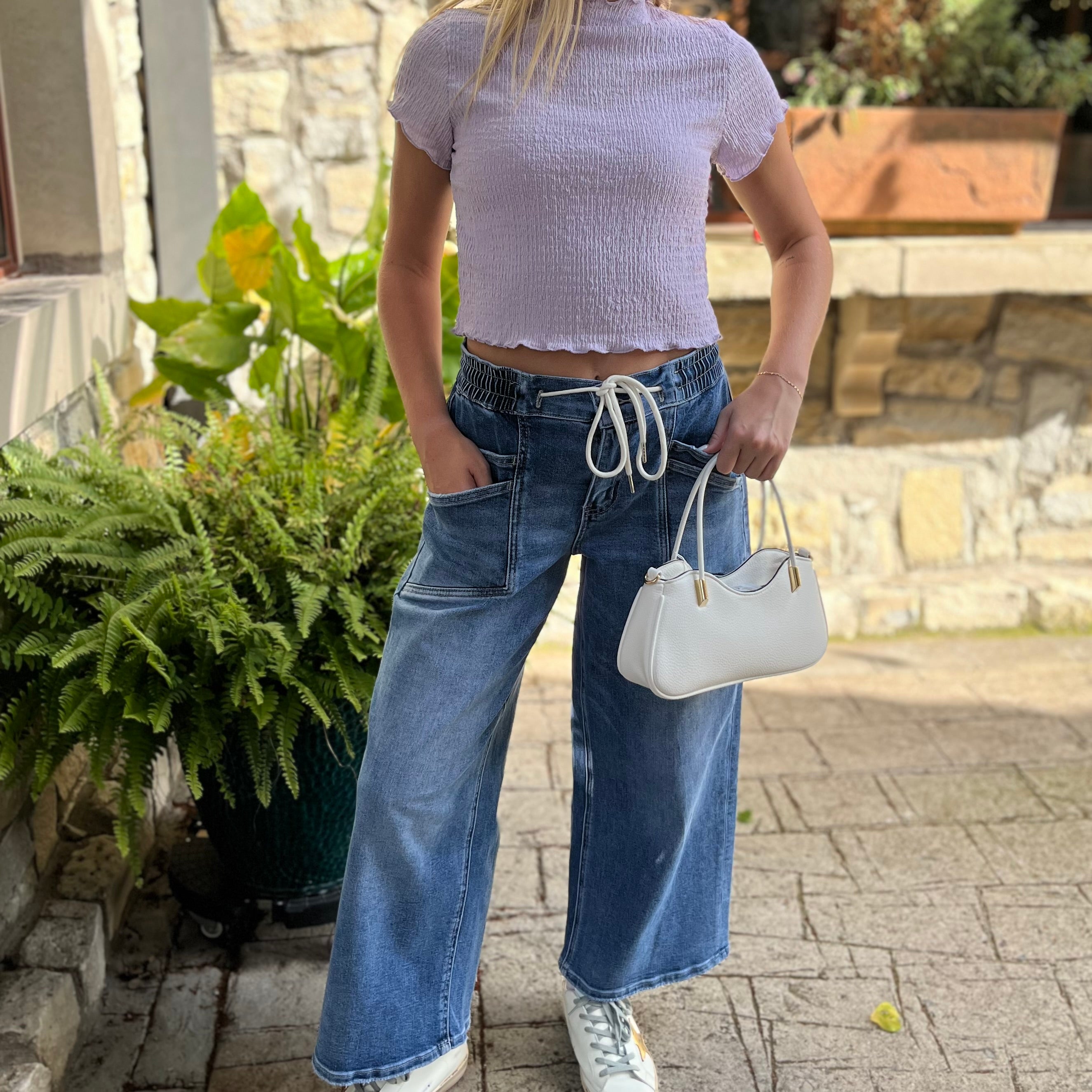 Elevate your casual style with these High Rise Drawstring Waistband Wide Leg Jeans — the perfect blend of comfort and contemporary fashion. Designed with a flattering high-rise fit, these jeans feature a soft, adjustable drawstring waistband that offers a customizable fit without sacrificing style. The wide-leg silhouette adds effortless movement and a touch of retro-inspired charm, making them ideal for both relaxed days and dressed-up moments.