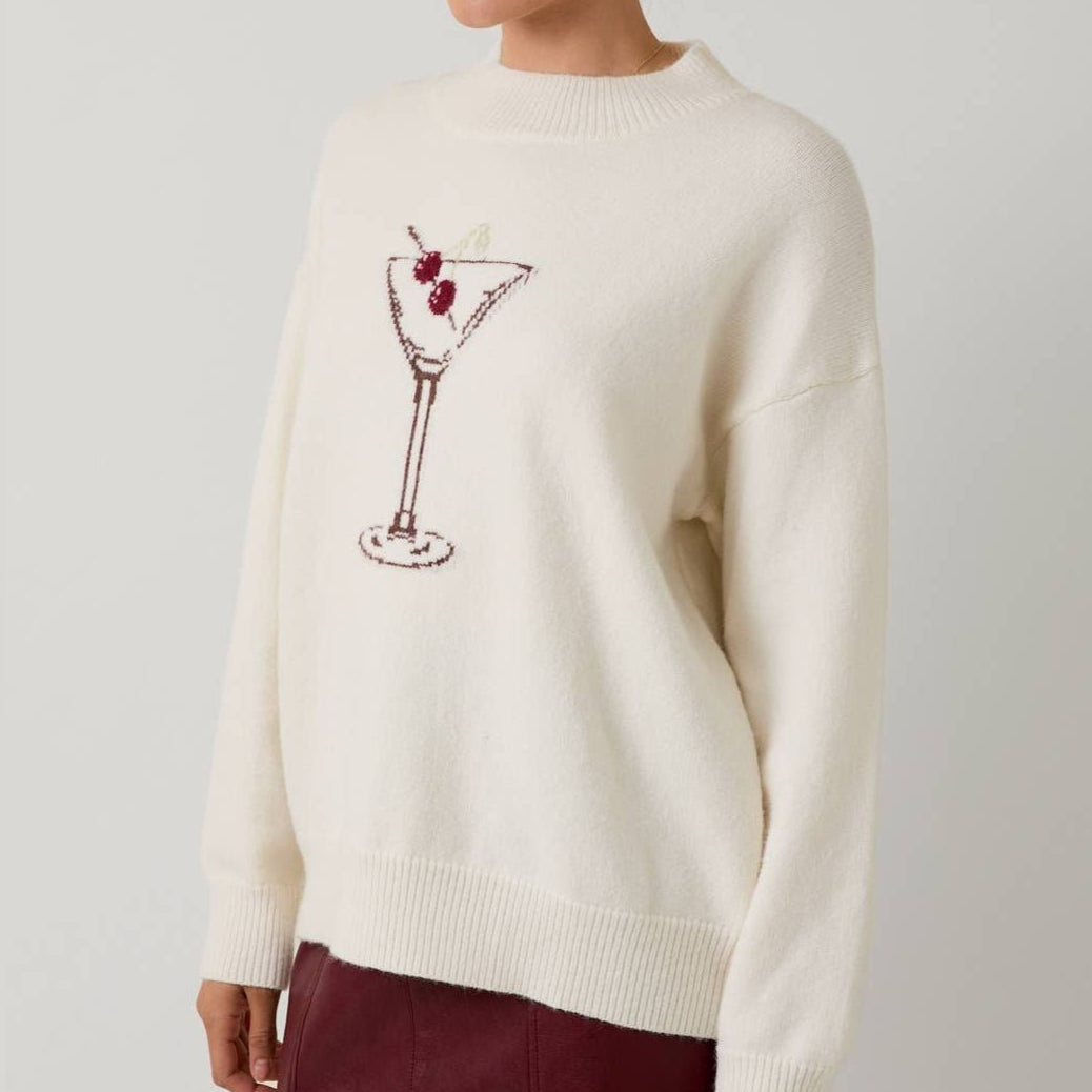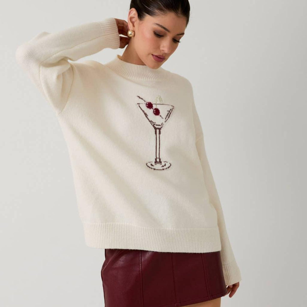 Raise a glass to cozy-chic style with this cream mock neck sweater featuring a playful burgundy martini glass design. Perfectly polished yet fun, this sweater makes a statement on its own and layers effortlessly over your favorite looks. Whether tied over your shoulders for that effortless preppy vibe or worn with jeans for a night out, it’s the perfect blend of flirty and sophisticated. A must-have knit that brings a touch of cocktail hour fun to your fall wardrobe.
