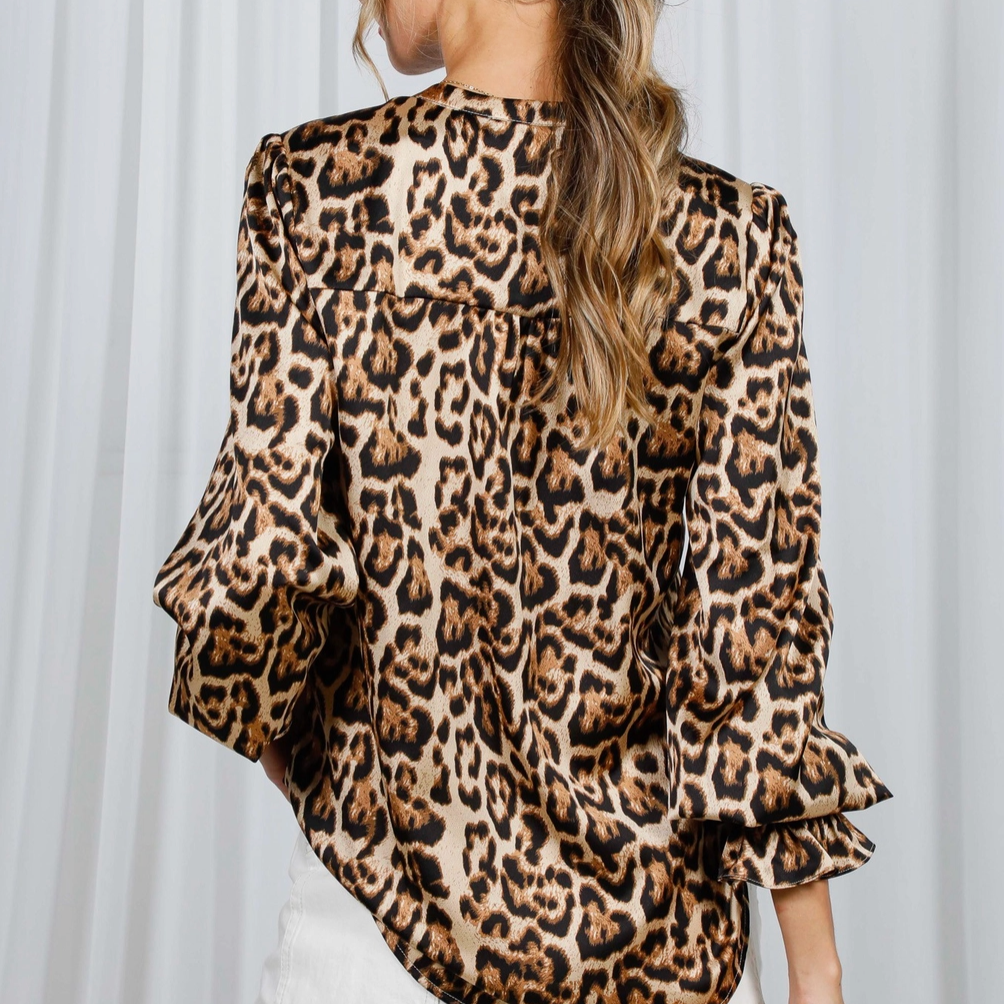 Our Savanna Smocked Leopard Henley Blouse combines bold animal print with delicate smocking details, creating a chic and flattering silhouette that effortlessly blends style and comfort!