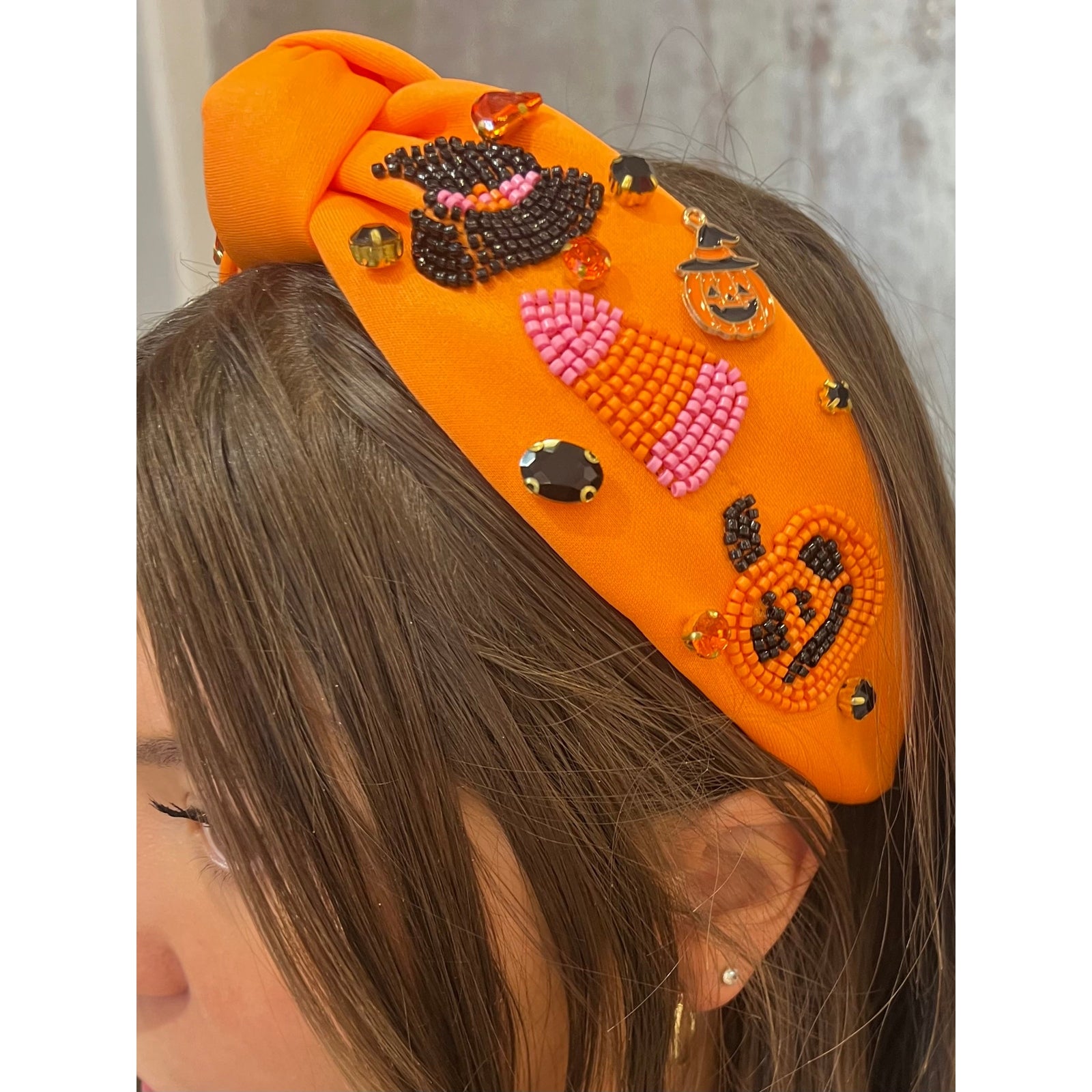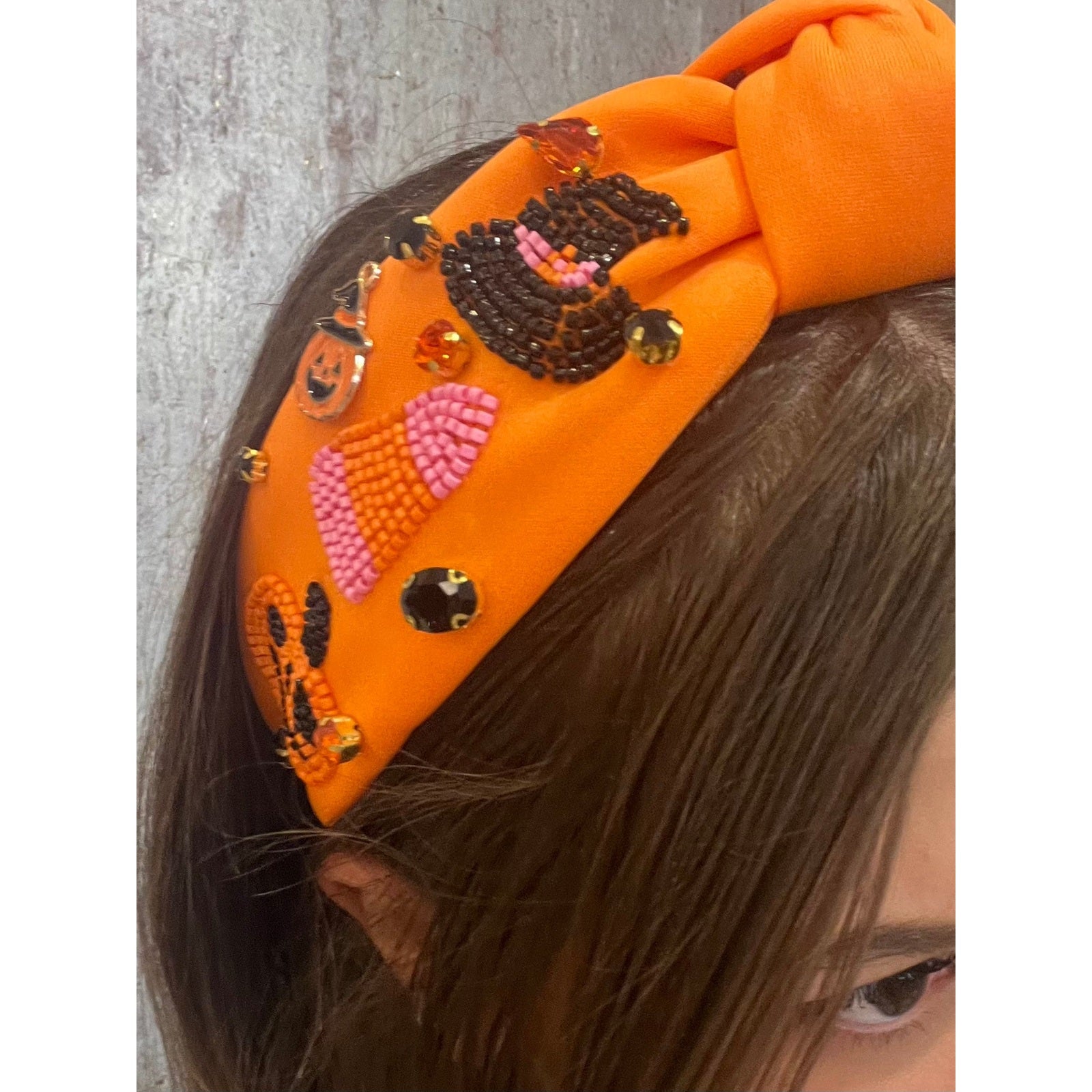 Add a little magic to your Halloween look with this festive knot headband! Designed on a bold orange base, it’s decked out with beaded witch hats, jack-o’-lanterns, and candy corn details. The perfect way to make any outfit instantly Halloween-ready, whether you’re headed to a spooky soirée, passing out candy, or just showing off your festive spirit.