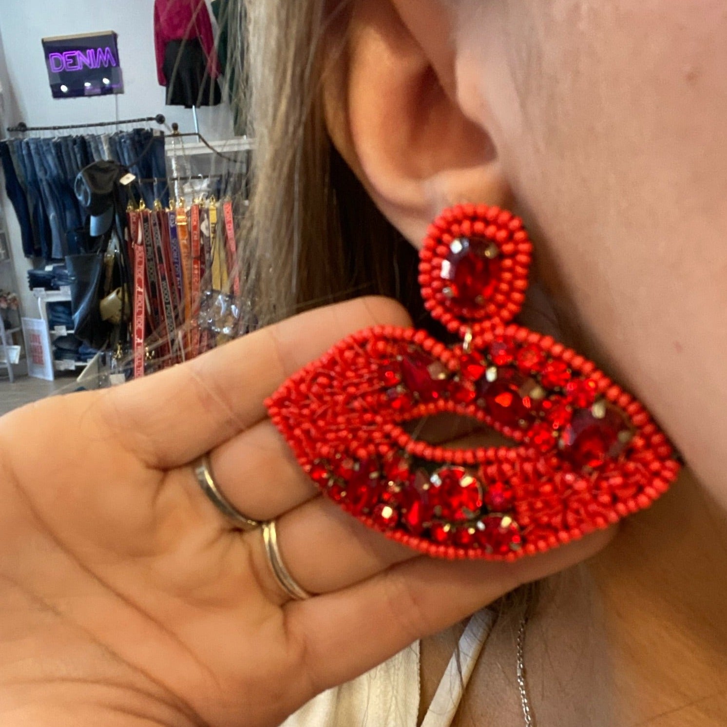 - Red lips with red jewels earrings