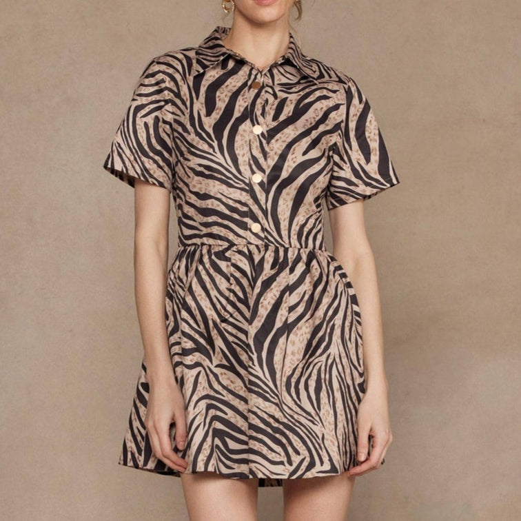 Bold, sleek, and effortlessly versatile - this zebra print shirt dress is the statement piece your wardrobe’s been waiting for. Crafted in a luxe stretchy satin twill with a puff mini skirt, gold button details, and a flattering spread collar, it’s perfect for everything from workdays to dinner dates to vacation nights out. Short sleeves, side pockets, and a lined finish make it as practical as it is striking. Dress it up with heels and jewelry or down with sneakers and a denim jacket - no matter how you style it, this dress guarantees all eyes on you.